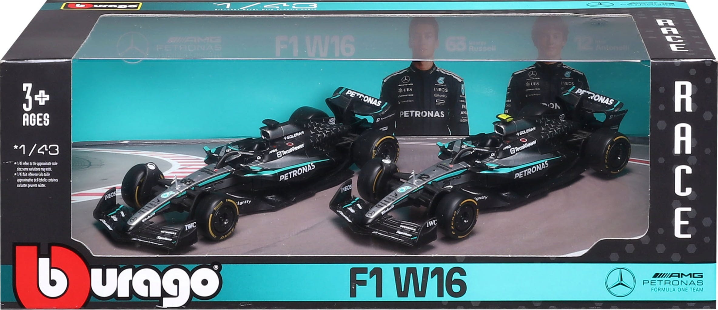 Bburago F1 Mercedes AMG Petronas ´25, 2er-Set, WB, #63 Russell/ #12 Antonelli, 1:43