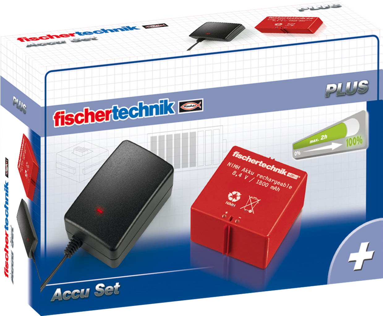 Das Accu Set bietet flexible, mobile Stromversorgung für alle fischertechnik-Modelle. Der leistungsstarke NiMH-Akku sorgt für lange Spielzeit, während das integrierte Ladegerät mit Mikrocontroller die Batterie zuverlässig vor Überladung schützt.
