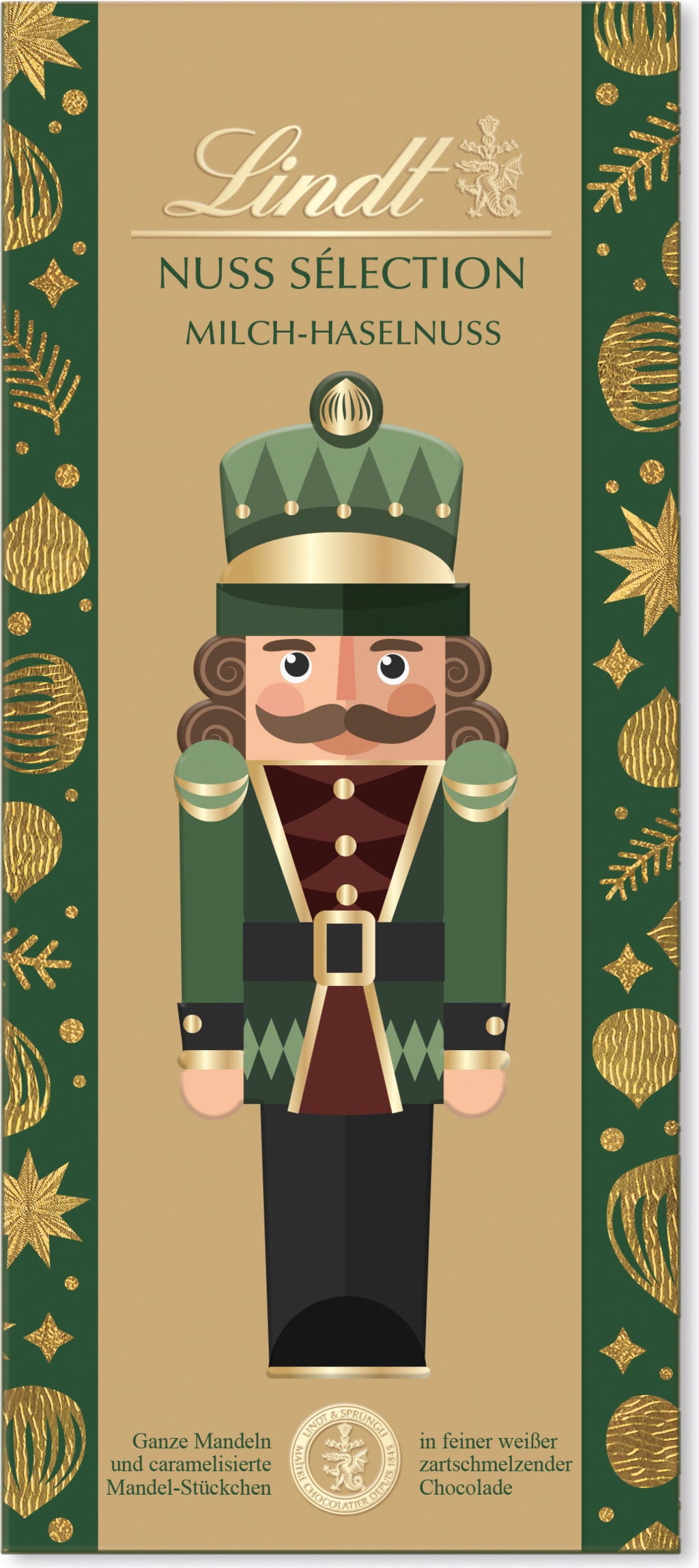 Verschenke Weihnachtsfreude mit der Nuss Sélection Schokoladentafel von Lindt. Unwiderstehlich zartschmelzende Schokolade, gefüllt mit ganzen Nüssen und karamellisierten Nussstückchen.