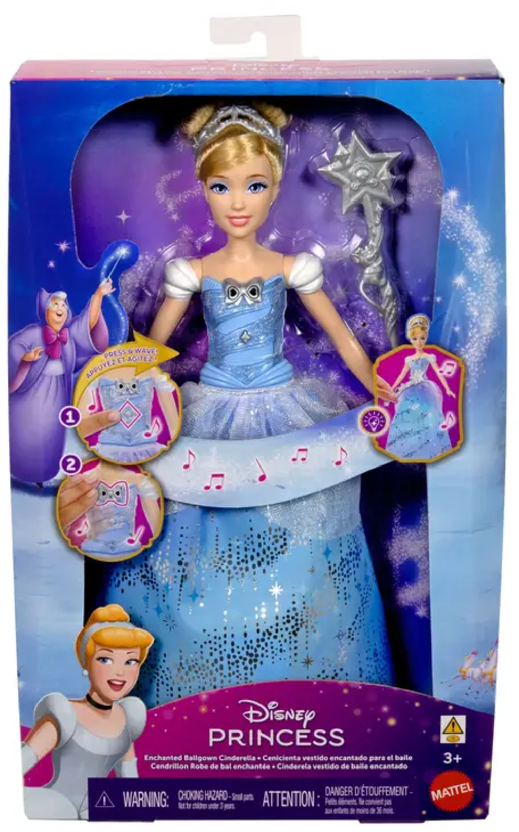 Mit der Cinderella-Modepuppe können Kinder die unvergessliche Ballszene aus dem Film Cinderella nachspielen. Das glitzernde Ballkleid, die magischen Licht- und Klangfunktionen sowie der Zauberstab lassen märchenhafte Momente lebendig werden. Perfekt für kleine Prinzessinnen, die ihre eigene zauberhafte Geschichte kreieren möchten!