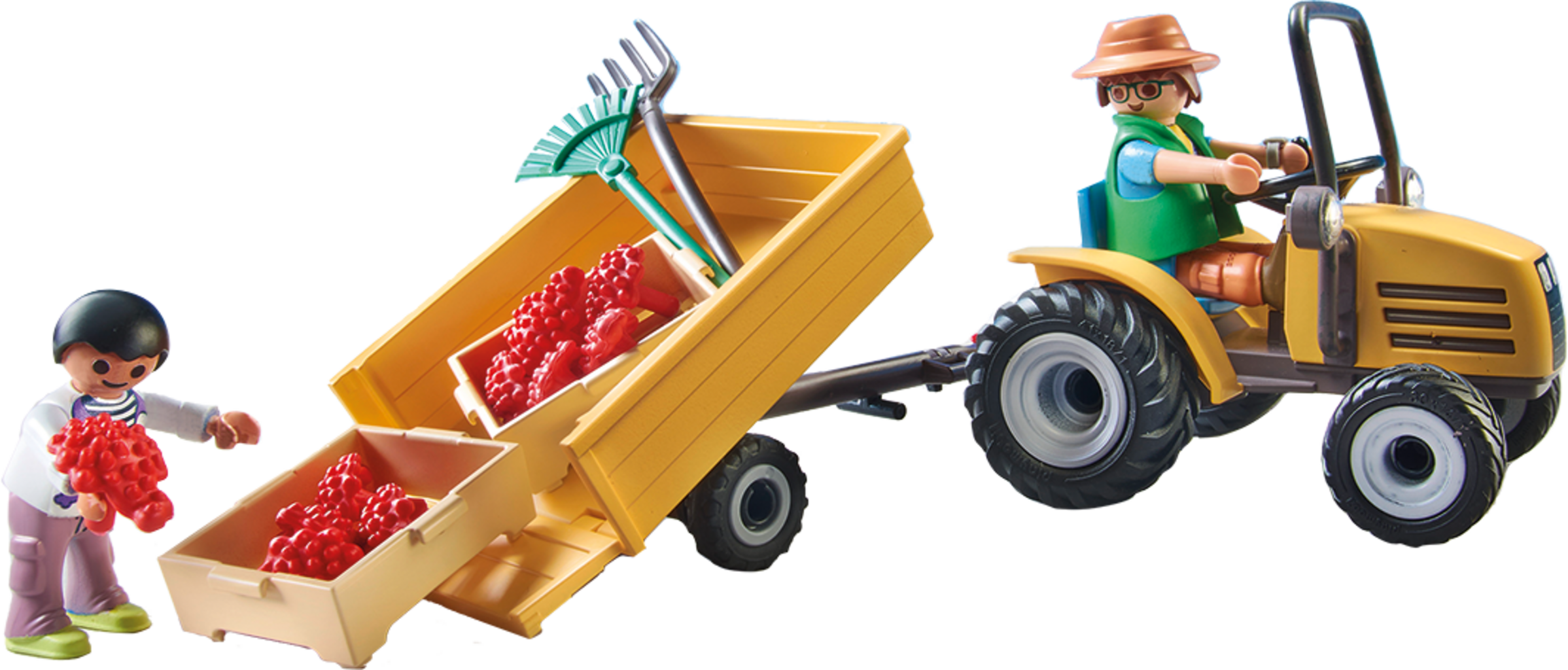 Zubehör: 1x Kleintraktor, 1x Anhänger, 1x Wasserfass; 1x Rosenschere, 2x Gemüsesteige, 1x Heckenschere, 1x Mistgabel, 1x Laubrechen, 1x Spaten, 2x Hacke, 1x Holzeimer, 10x Beeren-Dolde, 6x BS-Ranke, 13x Blüten, 1x Gras Ober- und Unterteil