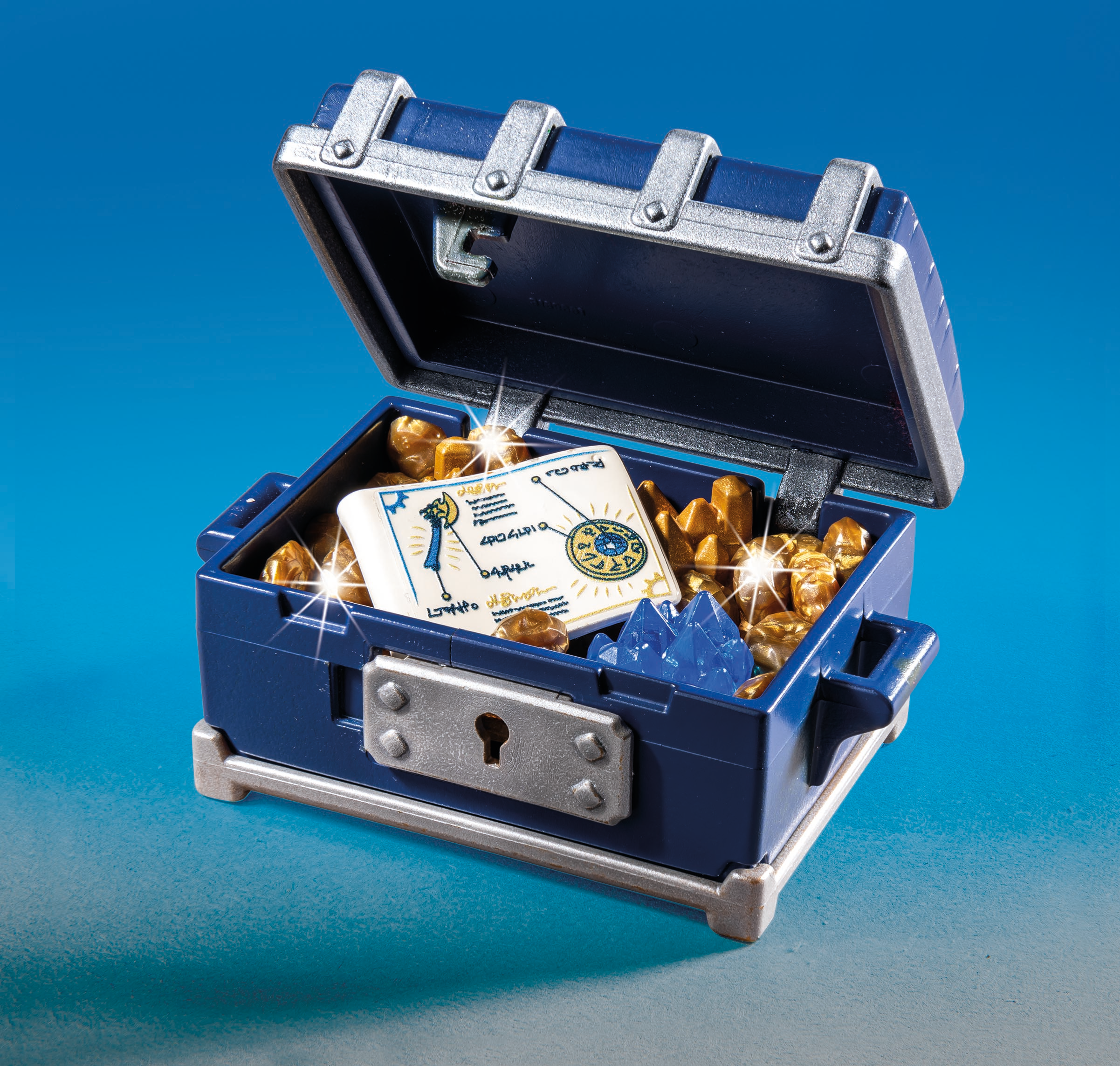 Zubehör: 1 Bodenplatte mit kippbaren Baum, 1 Pflanze, 1 Wegweiser zum Ritterturm, 1 Axt, 1 Bogen, 1 Pfeil, 1 Köcher, 1 Messer, 1 Schwert, 1 Peitsche, 1 Schild, 1 Lanze, 1 Amburst, 2 Ritterhelme, 1 Mütze, 1 Fahne, 2 Pläne, 1 Kutsche, 1 Truhe, Goldklumpen und Drachenstein