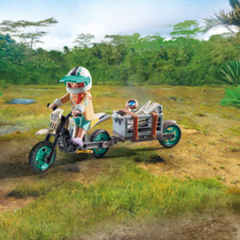 Zubehör: 1 Motorrad mit Anhänger, 1 Pfütze mit Fußabdruck, 1 Ast, Instrumente zum Vermessen, 1 Klemmbrett, 1 Stift, 1 Schraubenschlüssel, 1 Lupe, 1 Kamera, 1 Landkarte, Knochen, Exkremente, 1 Dino-Wissenskarte