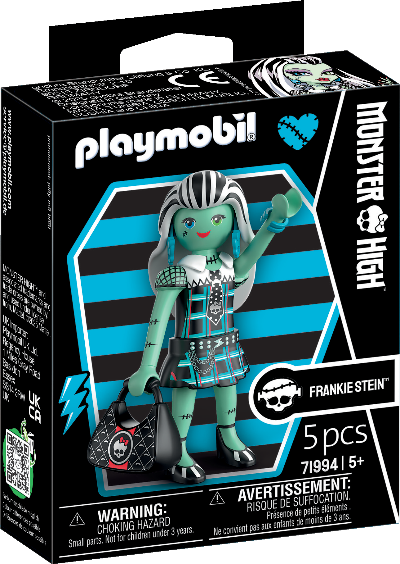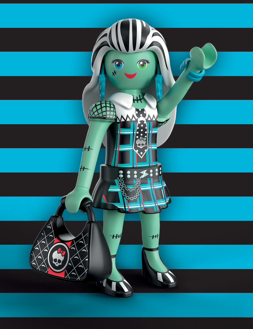 Bereit für monstermäßigen Spielspaß? Frankie Stein, die energiegeladene Schülerin der Monster High™, kommt jetzt als detailreiche PLAYMOBIL-Figur zu dir. Ihr unverwechselbarer Patchwork-Stil ist perfekt eingefangen und wird mit dem klassischen Charme von PLAYMOBIL kombiniert. Als blitzstarkes Accessoire hat sie ihre ikonische Handtasche im coolen Bolzen-Look dabei, die ihre Persönlichkeit perfekt unterstreicht. Dank des bewährten modularen PLAYMOBIL-Designs kannst du Frankie in die coolsten Posen bringen, indem du ihre Arme und Beine bewegst oder tauschst.