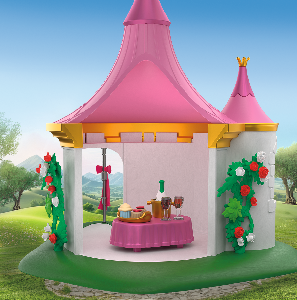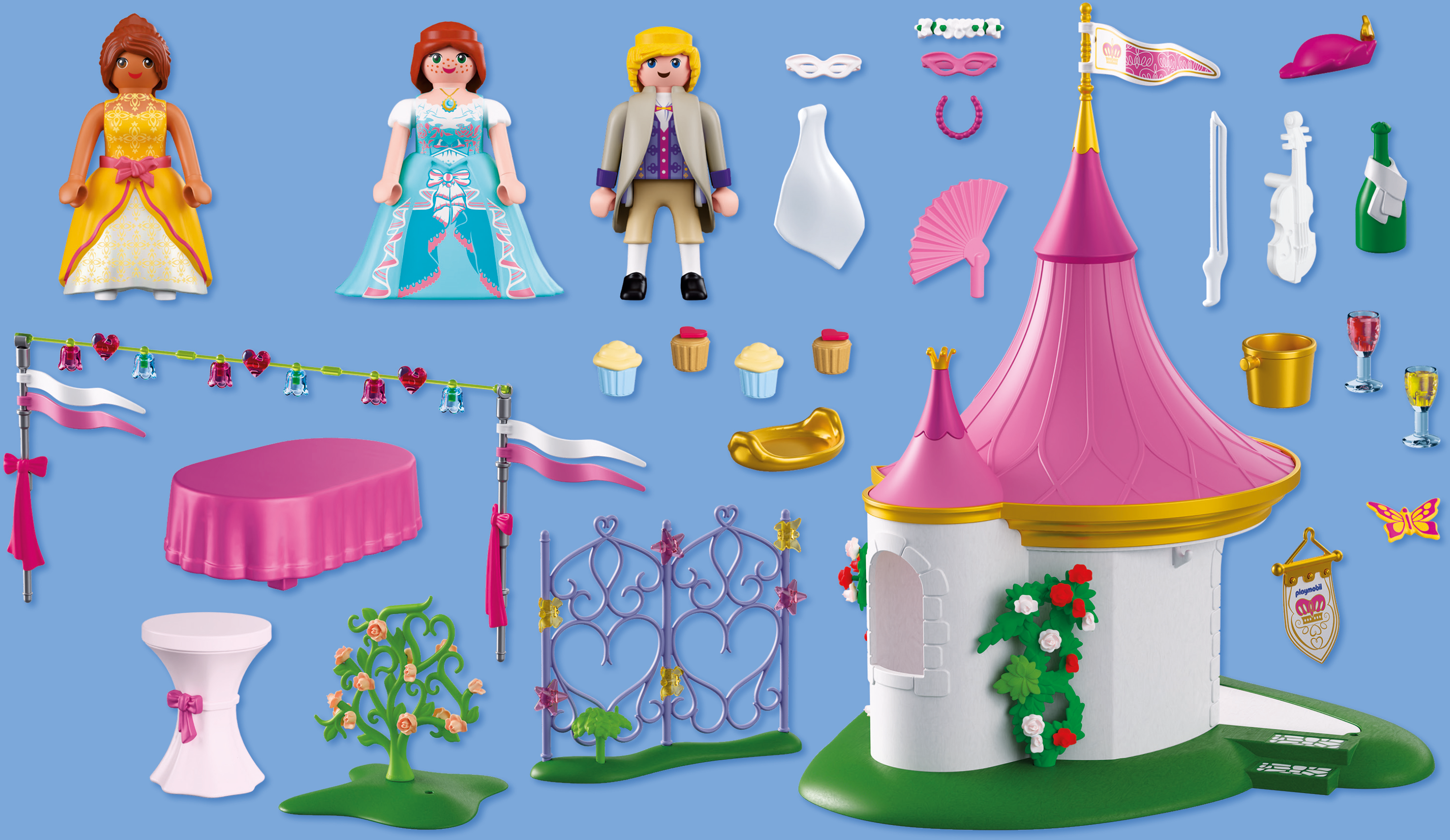 Feiere mit dem PLAYMOBIL Maskenball im Pavillon einen märchenhaften Tag im Schlossgarten! Zwei Prinzessinnenfreundinnen genießen Musik, Tanz und festliche Leckereien, während ein junger Hofgast mit Violine für die perfekte Stimmung sorgt. Girlanden, Fahnen und funkelnde Accessoires machen die Szene lebendig, und abnehmbare Röcke erlauben elegante Tanzbewegungen.