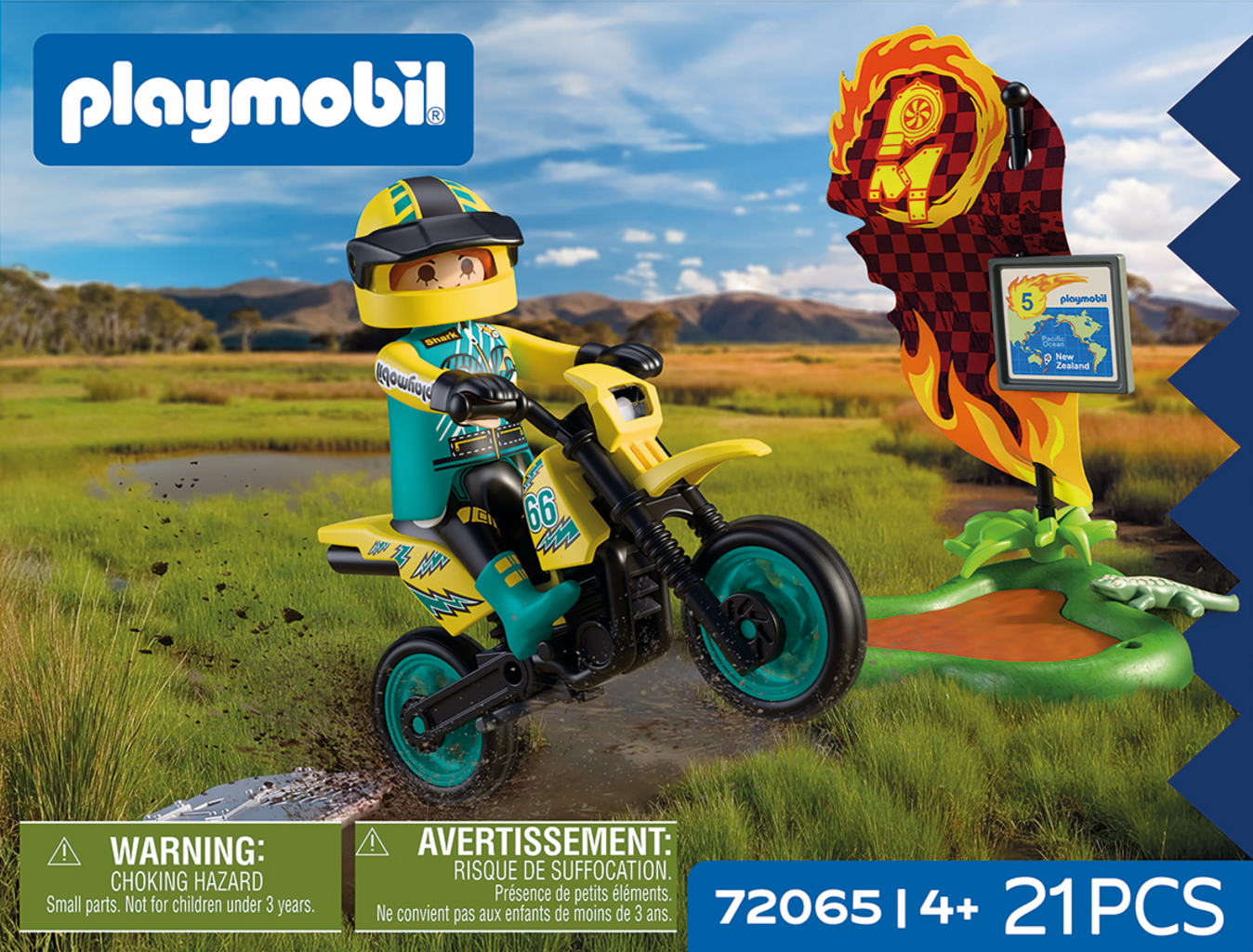 Mit dem PLAYMOBIL Offroad Motorrad sausen Kinder durch den neuseeländischen Sumpf. Die Rennfahrerin meistert Matschpfützen, nutzt die Rampe für Sprünge und navigiert mit Karte und Infotafel durch die Etappe. Pflanzen, Schlammpfützen und ein neugieriger Leguan sorgen für spannende, lebendige Szenen.