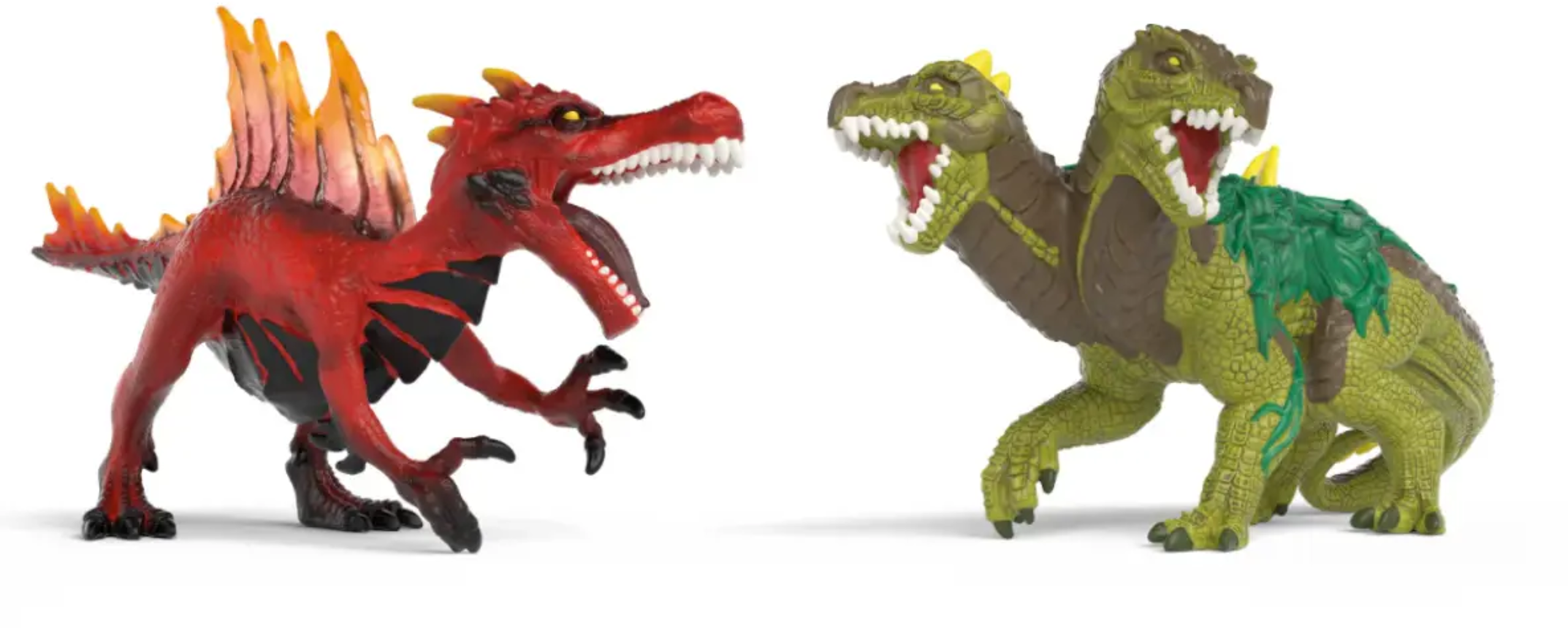 Wenn Lava auf Dschungel trifft, bebt Eldrador®! Der glühend rote Feuersaurier mit seinem flammenden Kamm und den gelben Augen stellt sich der mächtigen Dschungelechse, deren grüner Lianenpanzer und zwei furchteinflößende Köpfe sie zu einem gefährlichen Gegner machen. Beide Kreaturen liefern sich einen erbitterten Kampf um die Vorherrschaft ihrer Welten – und ihr donnerndes Gebrüll hallt durch ganz Eldrador®.