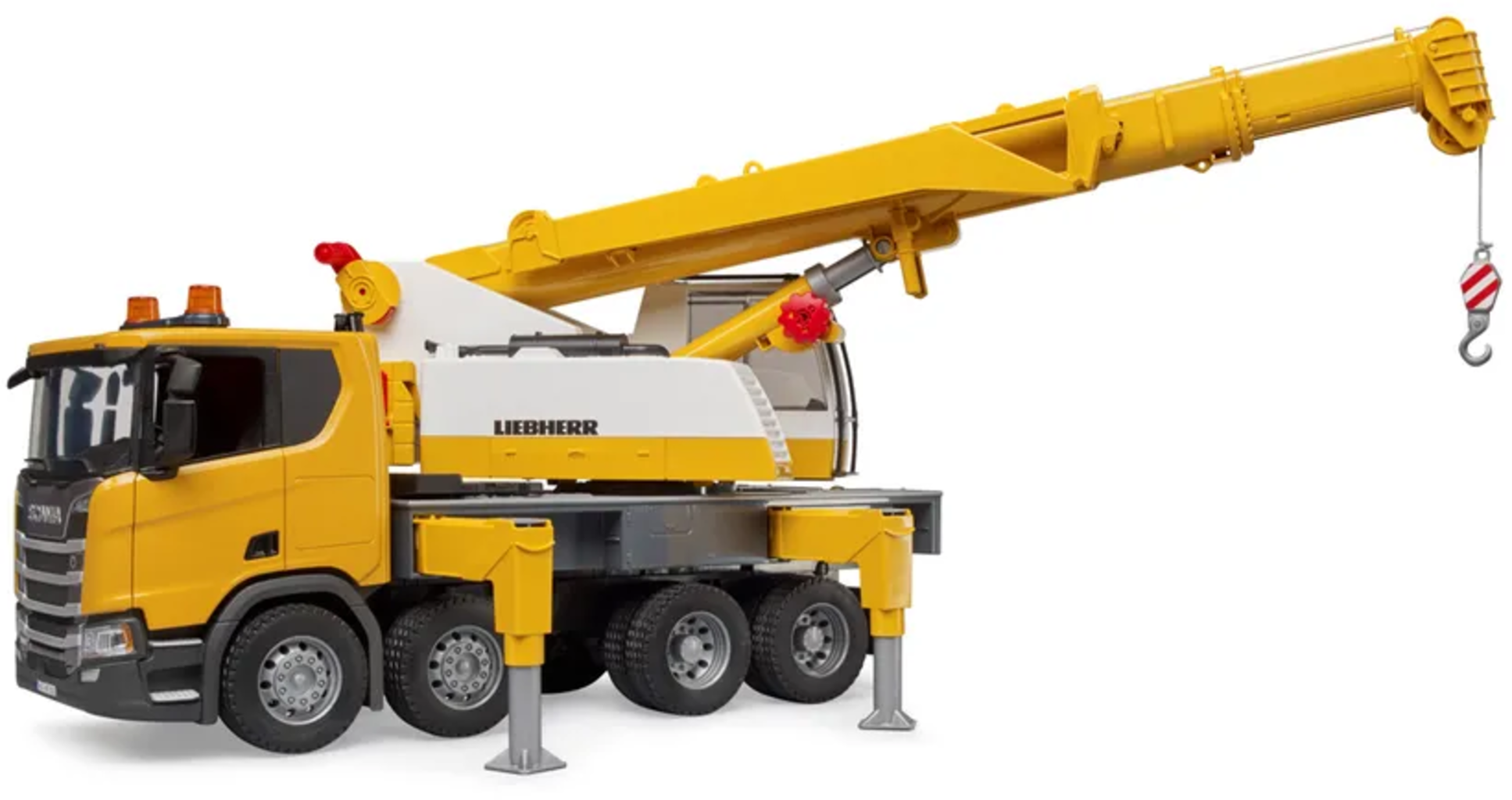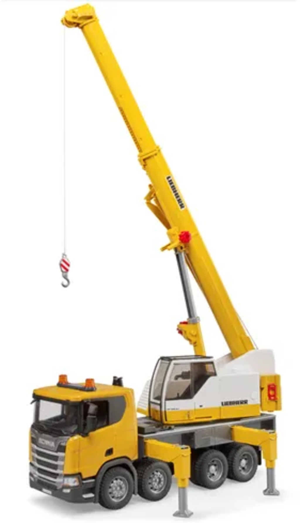 Les petits fans de chantiers et de véhicules auront beaucoup de plaisir avec le camion-grue Scania Super 560R Liebherr. Ce jouet n'a presque rien à envier à son grand modèle. Le point fort est bien sûr le bras de grue extensible qui, une fois entièrement déployé et redressé, atteint une hauteur incroyable de 130 cm !
