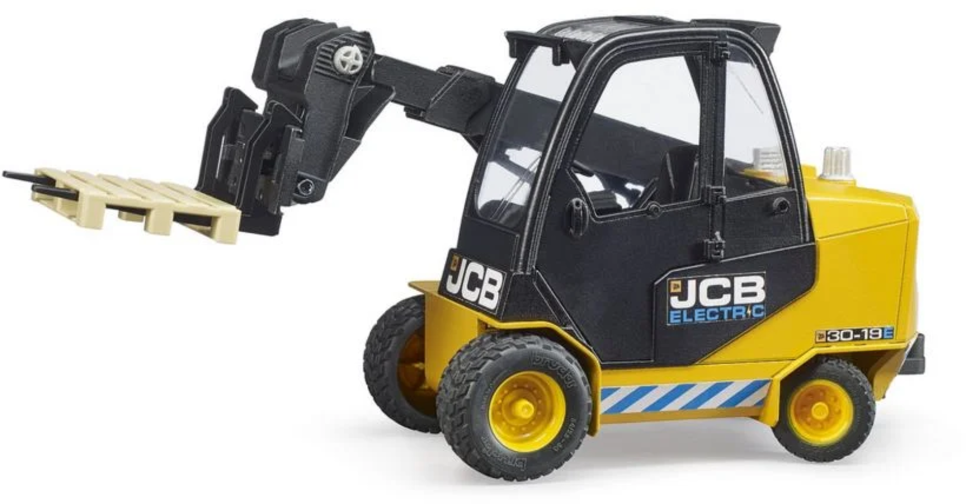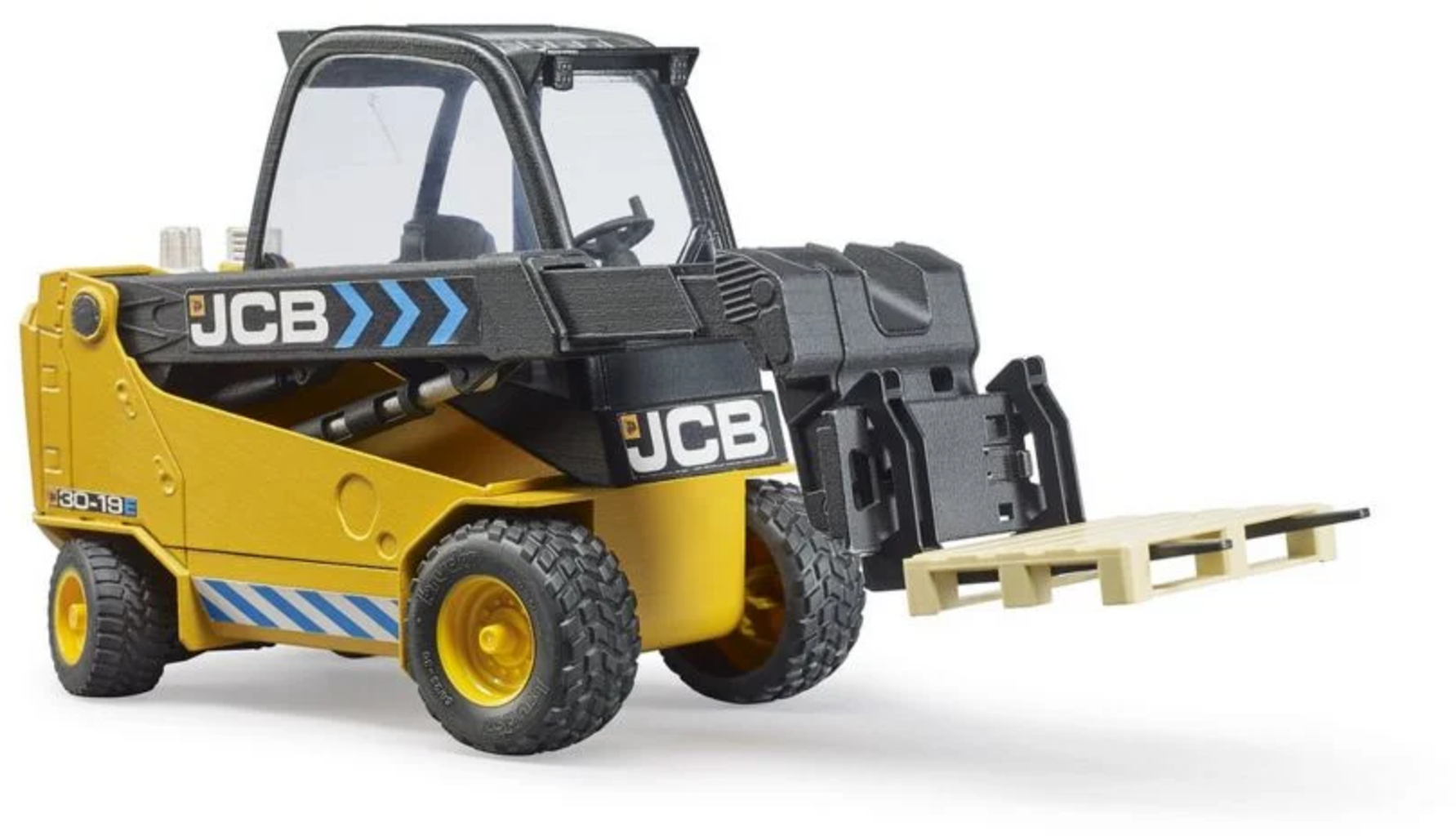 Apportez une véritable aide au travail dans l'entrepôt avec le JCB Teletruk. Le transport des marchandises de l'entrepôt au camion devient un jeu d'enfant grâce à la palette incluse. L'essieu arrière est orientable et une figurine Bruder peut s'asseoir dans la cabine. La fourche du chariot élévateur est réglable en hauteur et peut accueillir une palette.