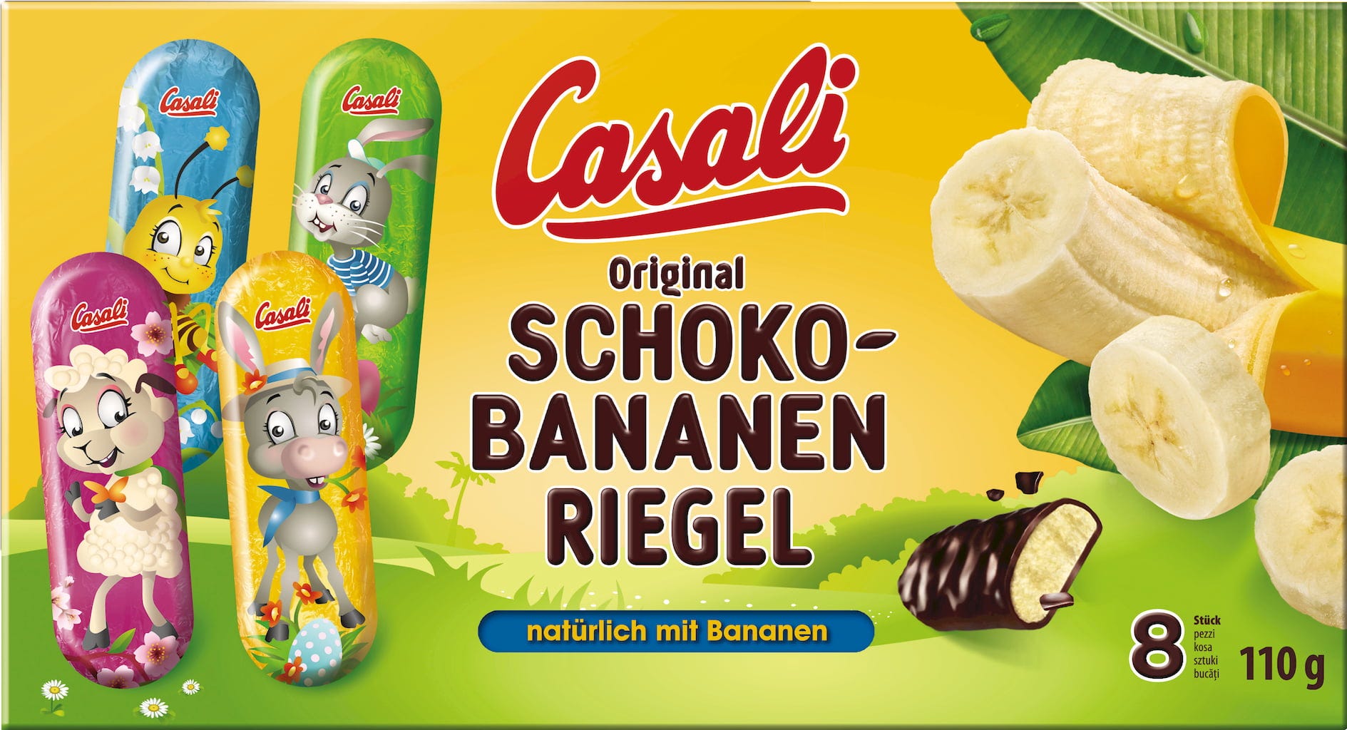 Les Choco-Bananes de Casali font partie des friandises pour enfants les plus populaires en Autriche. La mousse de banane onctueuse réalisée à partir de véritable pulpe de banane est recouverte d'une fine couche de chocolat croquant. Une combinaison de saveurs fruitées vraiment irrésistible, ici dans une version de Pâques avec un emballage représentant de mignons personnages colorés.
