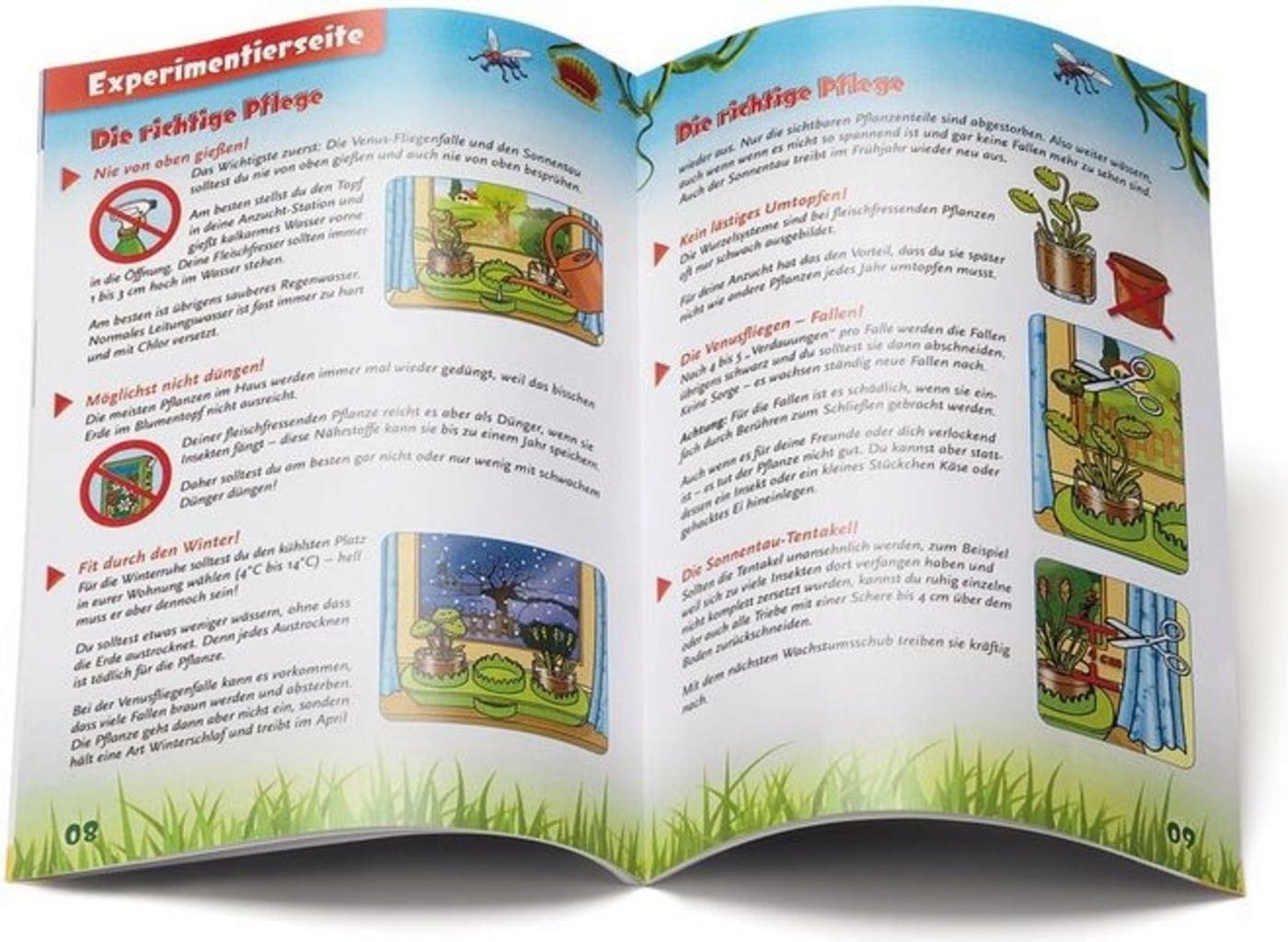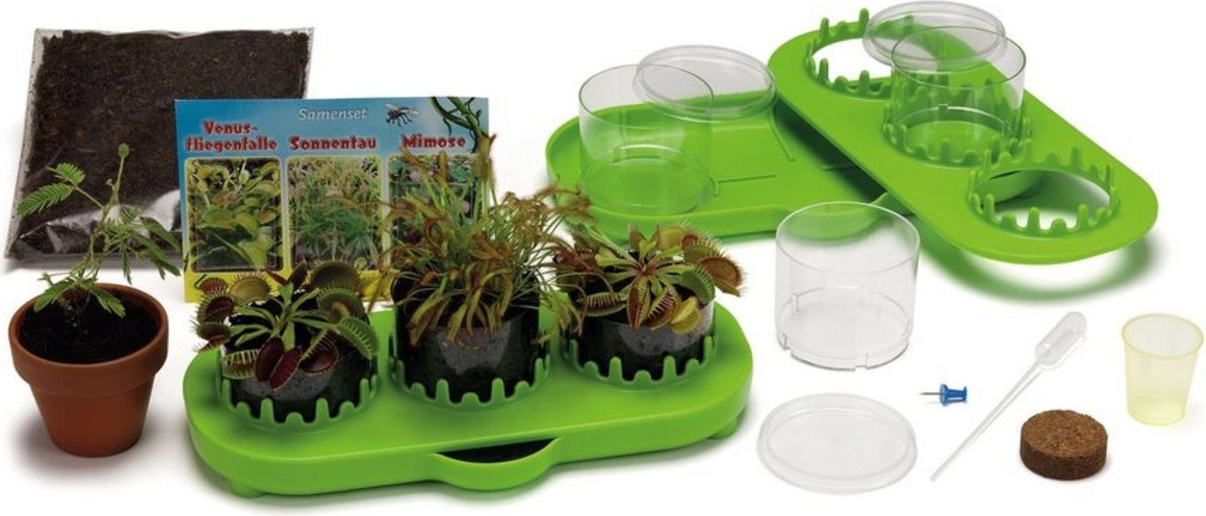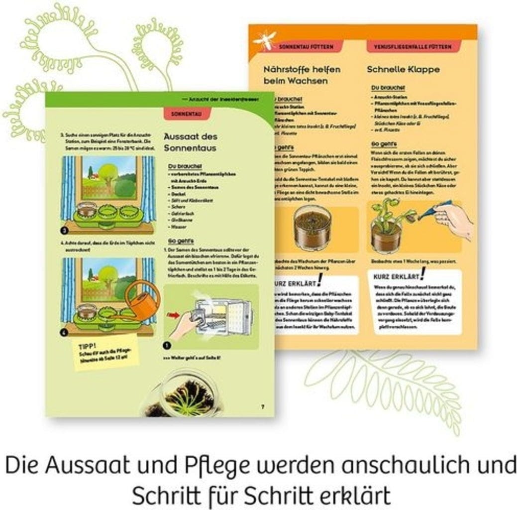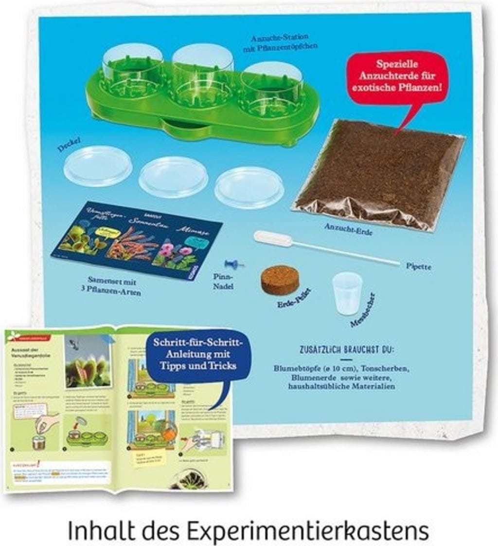 Contenu : mode d'emploi en allemand (32 pages), station de culture, 3 pots de culture, 3 couvercles de pots, terreau, granulés, set de graines (Dionée attrape-mouche, droséra, mimosa), verre doseur, pipette, épingle.