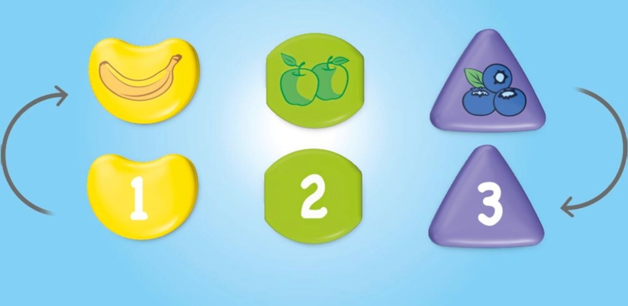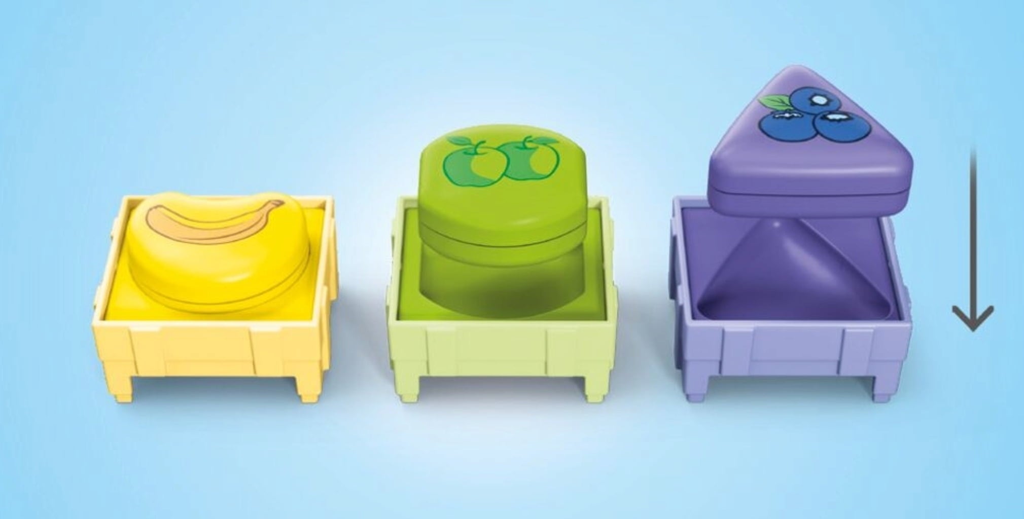 - Accessoires : 1 camion de transport de fruits, 1 porte arrière qui s'ouvre vers le bas, 3 caisses empilables contenant chacune 1 pièce de puzzle de couleur assortie.