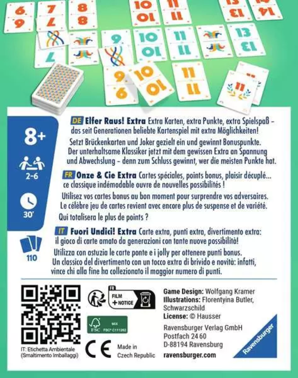 Le classique populaire Elfer Raus est maintenant disponible avec encore plus de possibilités. Le principe de base reste le même : essayez de vous débarrasser de vos cartes en les plaçant, triées par couleur, sur les séries de chiffres déjà existantes. De nouvelles cartes Joker et Brücke apportent encore plus de suspense. Un jeu divertissant qui captivera toute la famille !
