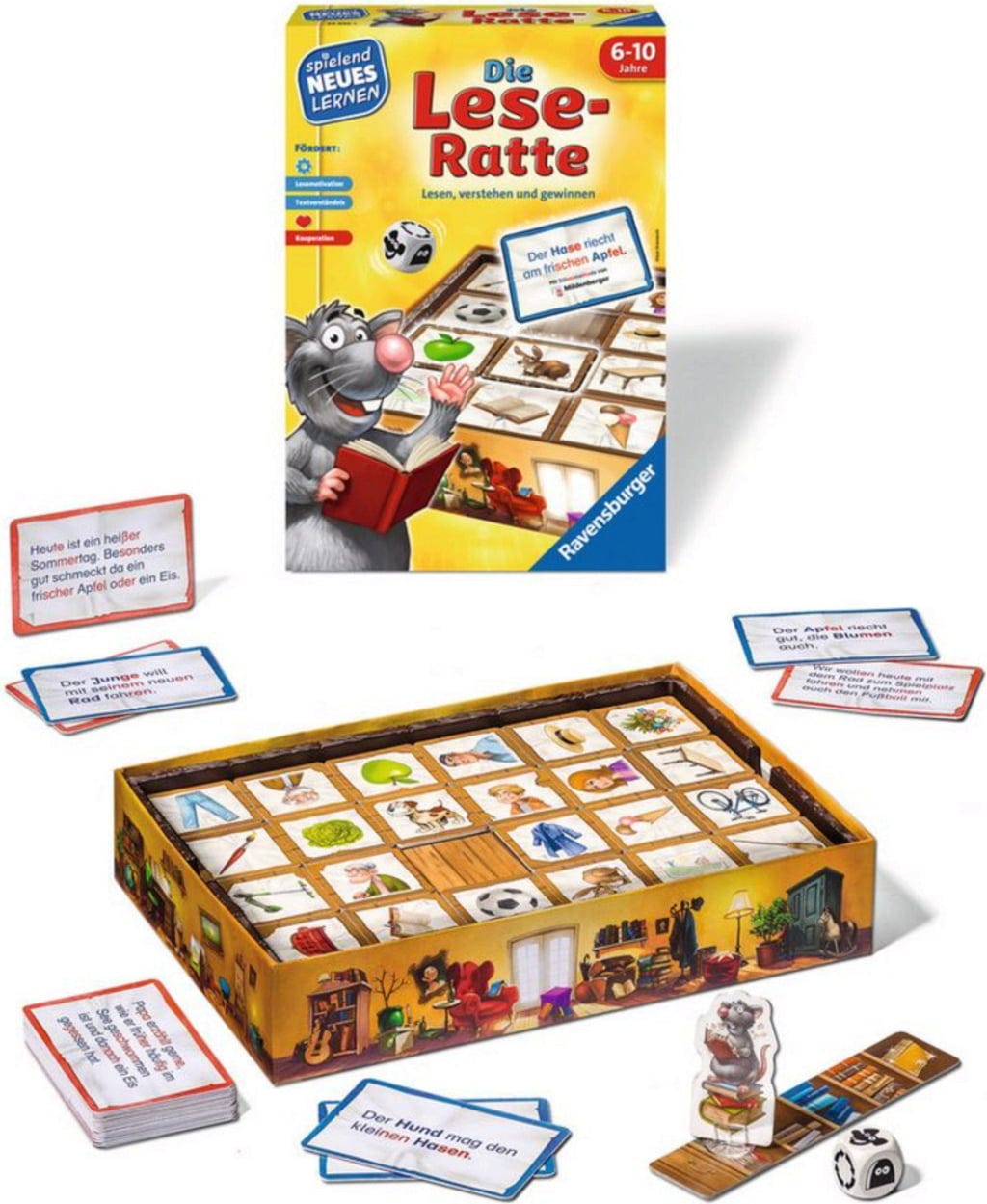 Dans ce jeu éducatif passionnant, les explorateurs de 6 ans et plus suivent le Rat Lecteur à travers la bibliothèque. Tour à tour, ils lisent attentivement différentes cartes de tâches et associent les images correspondantes sur le plateau de jeu. Mais attention : le Rat Lecteur malicieux ronge de plus en plus vite les pages des livres et ne peut être arrêté que lorsque toutes les tâches sont résolues.
