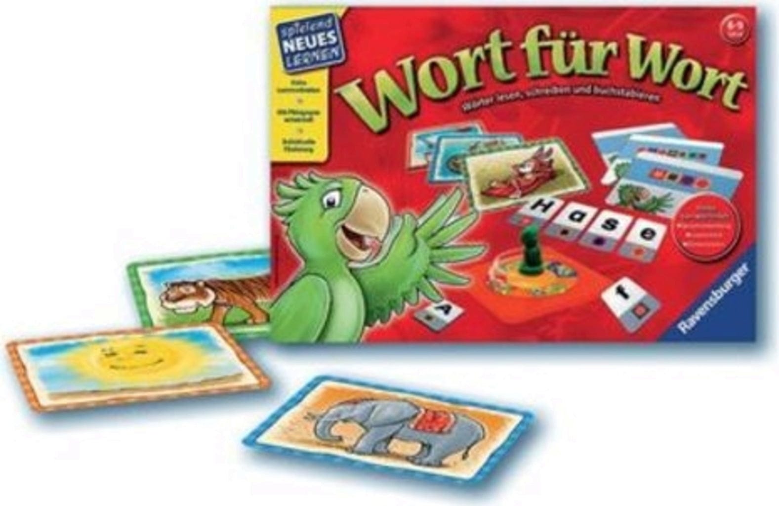 Contenu : 45 cartes illustrées, 90 jetons de lettres, 1 roue rotative avec perroquet