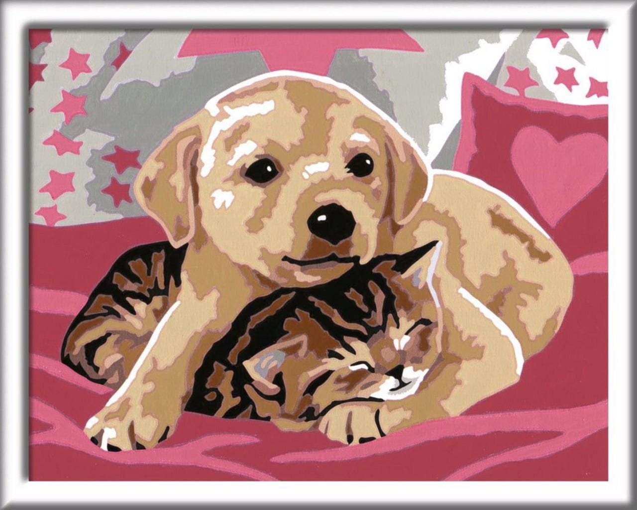 Ce superbe kit de peinture par numéros prouve qu'un artiste sommeille en chacun de nous, n'attendant que de montrer son talent. En coloriant les zones numérotées, les peintres en herbe sont guidés par les lignes colorées du motif, ce qui facilite l'identification de la couleur à utiliser. C'est ainsi que naît progressivement un magnifique tableau représentant les deux meilleurs amis, le chien et le chat.