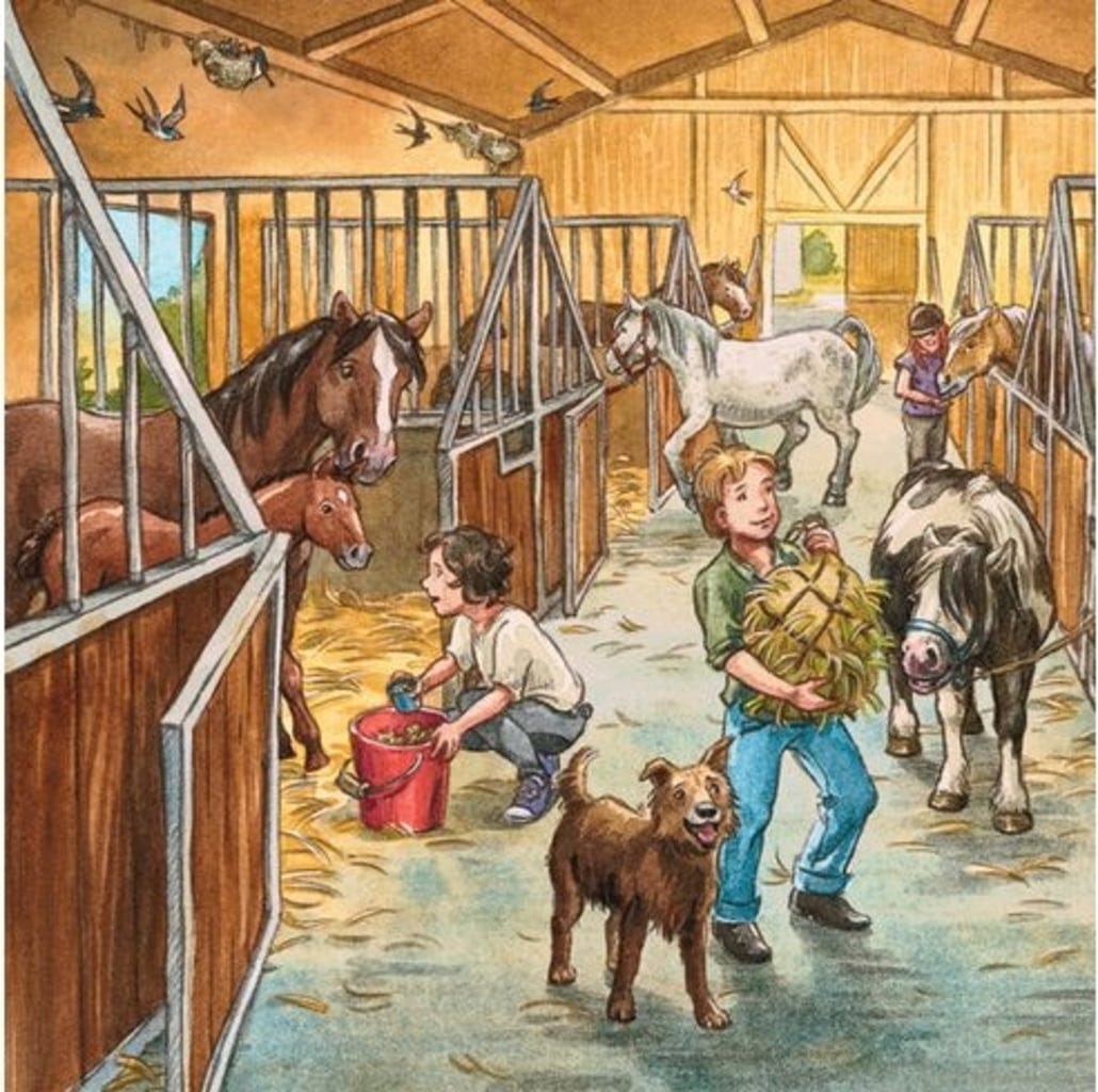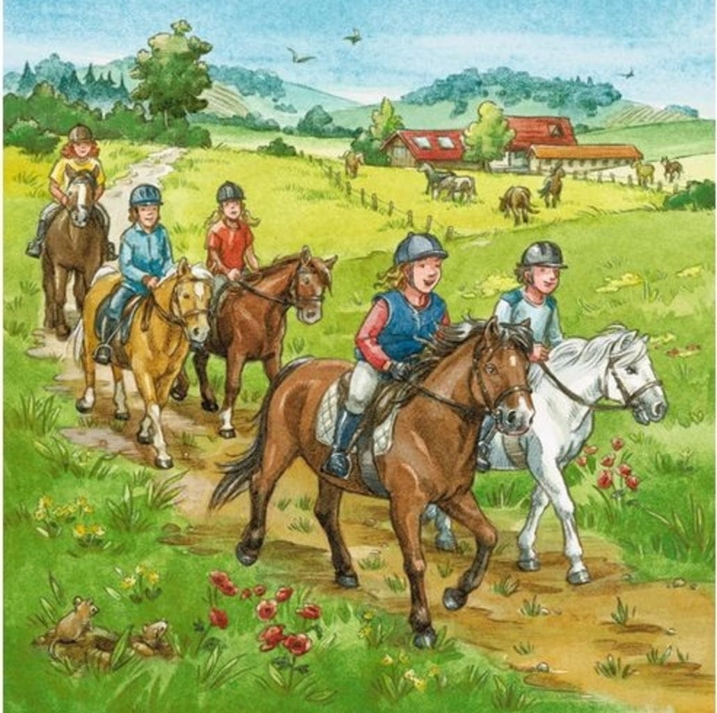 Au centre équestre, chaque jour est une aventure. Mais avant de pouvoir faire une agréable balade à cheval, il faut s'occuper des animaux. Trois beaux motifs feront briller les yeux des fans de chevaux.