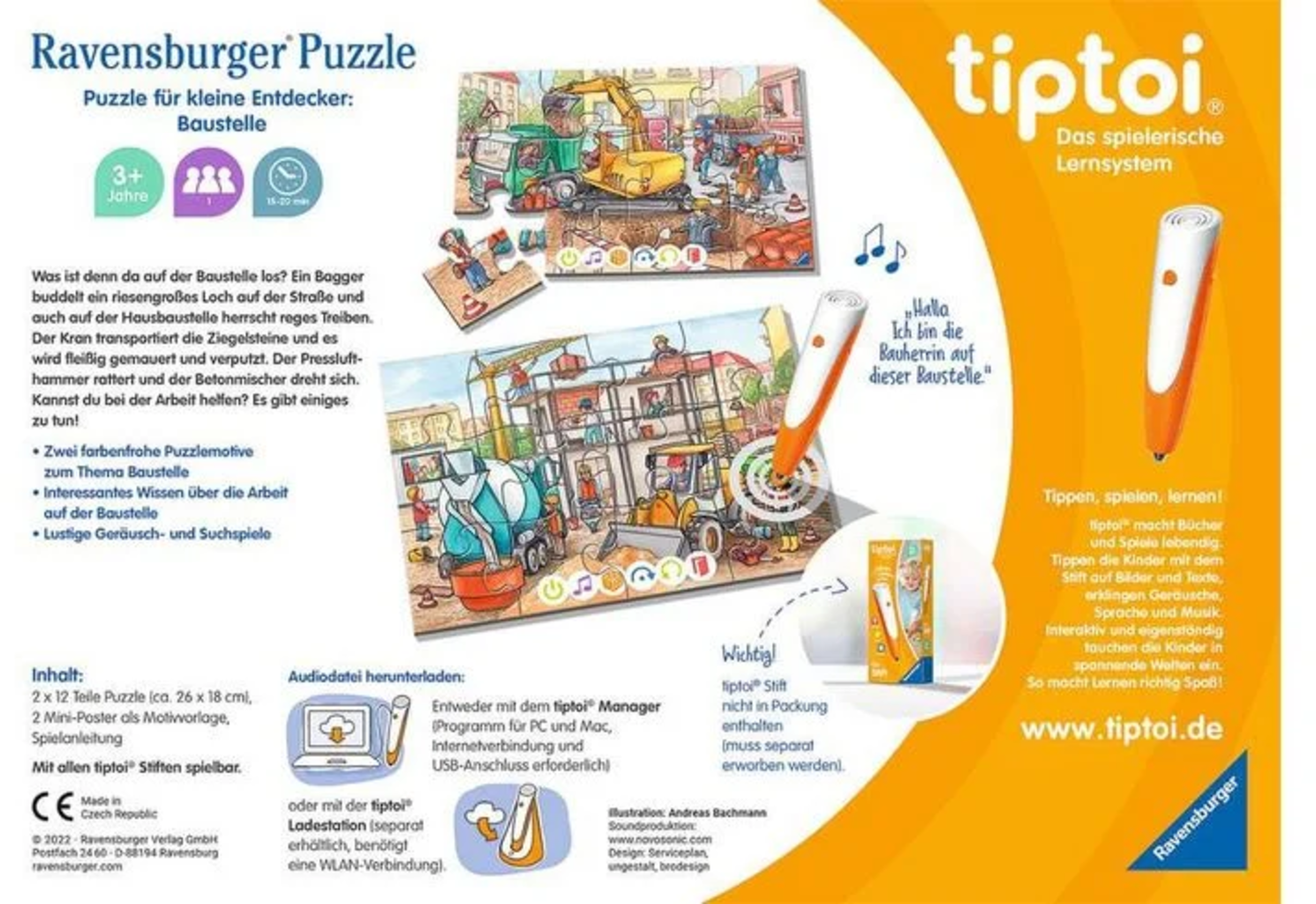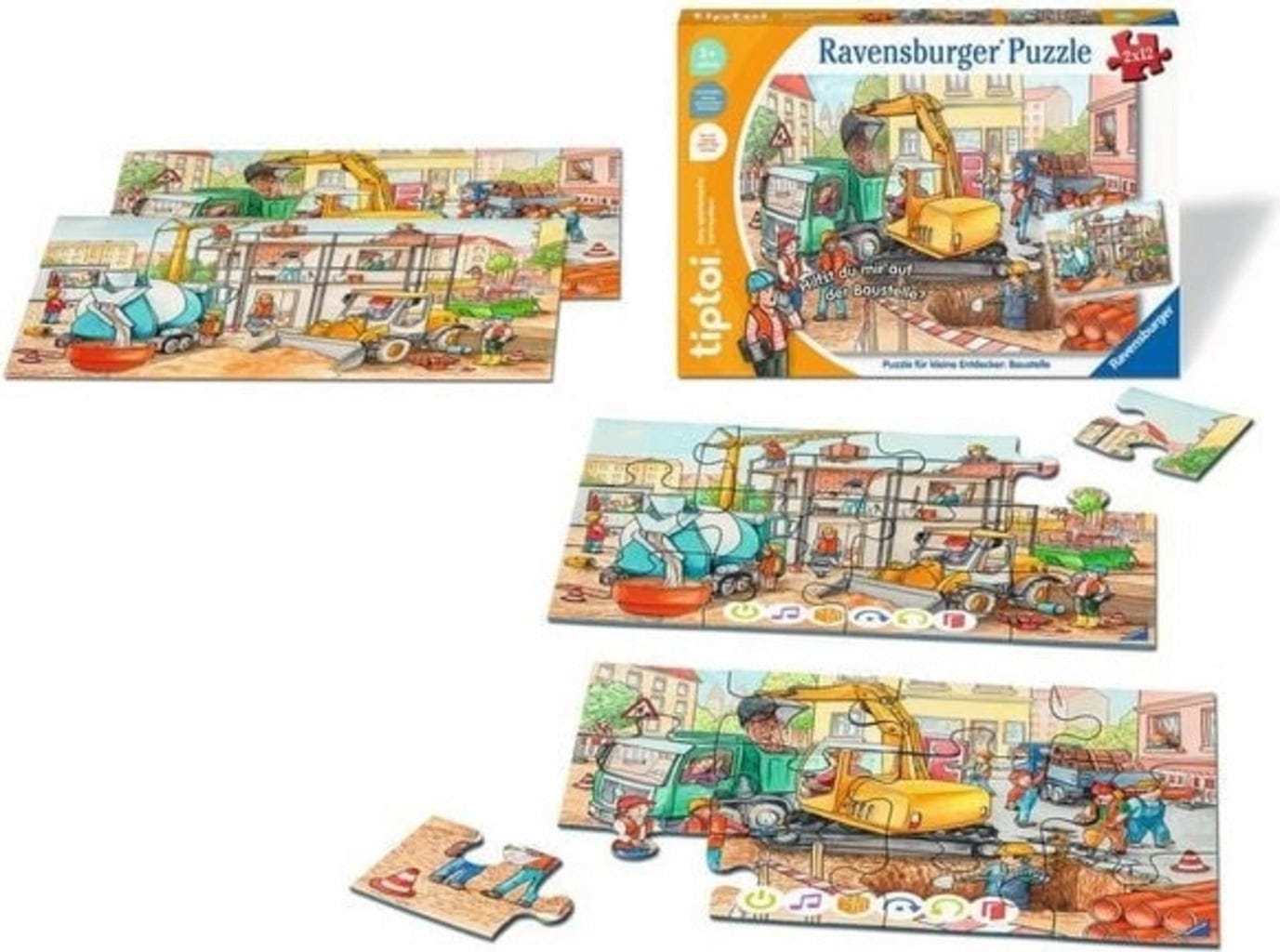 Quels véhicules trouve-t-on sur un chantier ? À quoi sert un marteau-piqueur ? Et comment utiliser correctement une grue ? Une fois les deux puzzles riches en détails assemblés, les petits explorateurs peuvent explorer les motifs à l'aide de leur stylo tiptoi (non inclus). Des contenus audio adaptés à l'âge offrent de nombreuses informations passionnantes. Des jeux de recherche et de sons amusants offrent un divertissement supplémentaire.