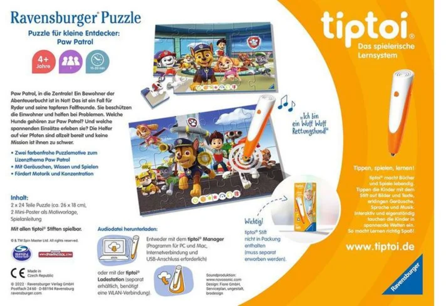 Comment s'appellent les braves héros de Paw Patrol ? Comment se déroulent leurs missions ? Ces questions et bien d'autres trouveront leurs réponses grâce au stylo tiptoi. Mais d'abord, il faudra assembler les deux puzzles. Une activité formidable qui développe la motricité fine et la concentration !