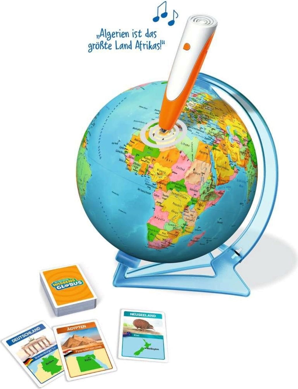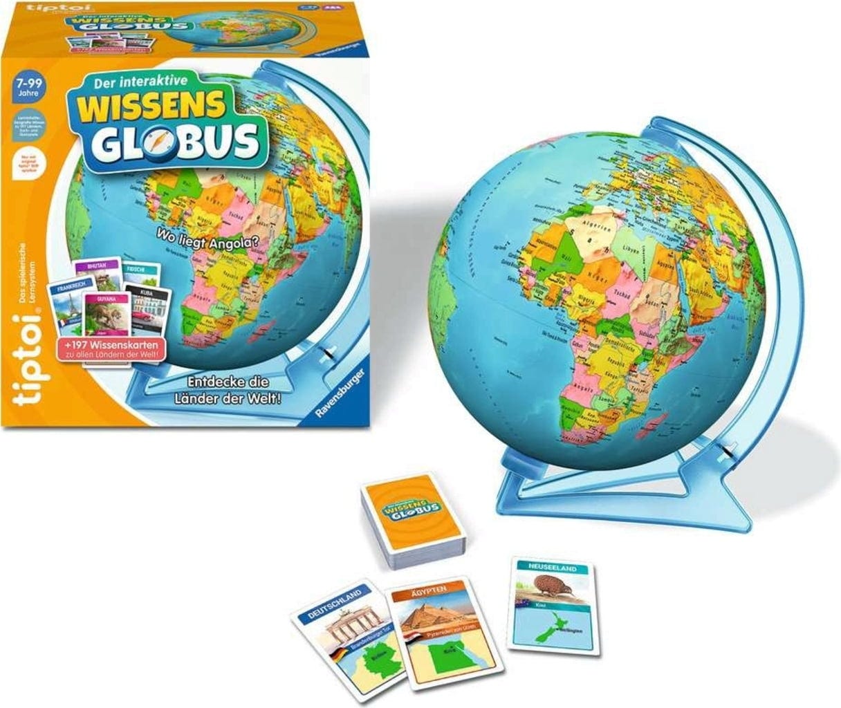Contenu : 1 globe (composé de 2 demi-sphères), diamètre env. 23 cm, 1 support rotatif, 200 cartes de jeu.