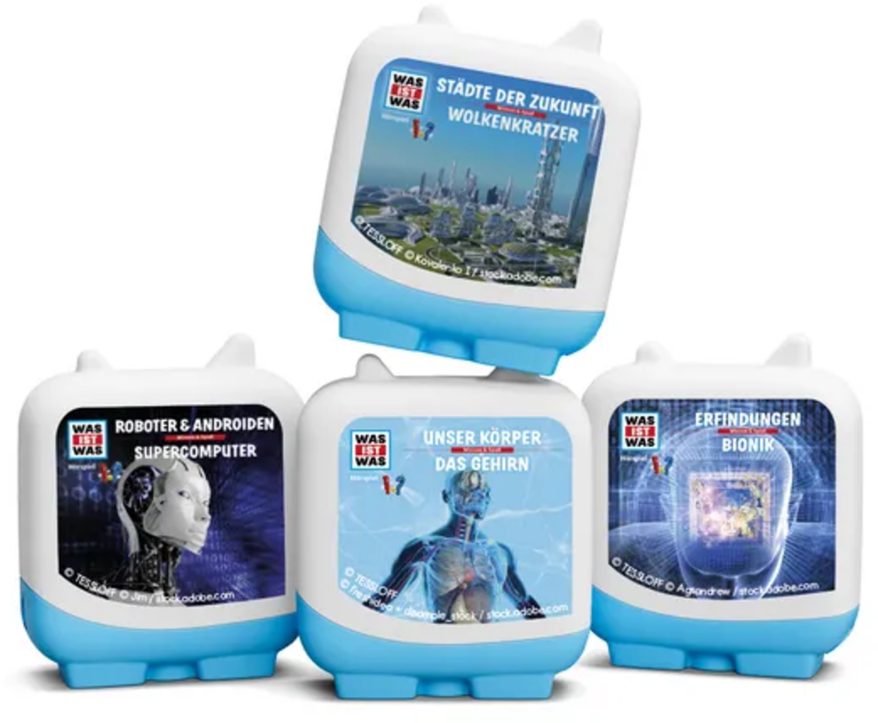 Les Clever-Tonies (en allemand) sont conçus de manière adaptée aux enfants d’âge pré-scolaire et scolaire. Des faits incroyables, des découvertes passionnantes et des réponses intelligentes à des questions futées transforment l’apprentissage en une véritable expérience d’écoute. Spécialement conçus pour les enfants plus grands, ils se reconnaissent à leur design anguleux et peuvent en plus être empilés de manière décorative.