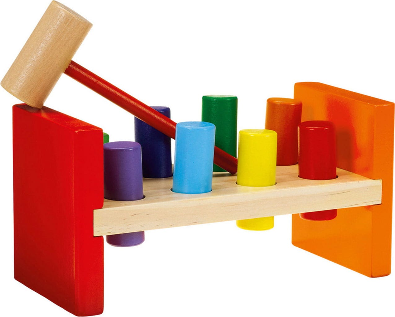 Les enfants à partir de 12 mois peuvent tester et développer leurs compétences motrices fines avec ce banc à marteler coloré. De manière ludique, les enfants apprennent à mieux connaître les différentes couleurs et sont encouragés à taper sur les pièces en bois individuelles avec le petit marteau inclus, comme de petits artisans. Une fois toutes les chevilles enfoncées, le banc peut être facilement retourné et le plaisir de taper au marteau continue !