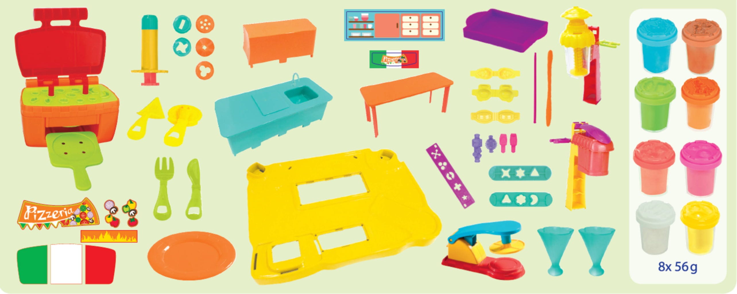 Mmh, ça a l'air délicieux ! Ici, les petits chefs en herbe peuvent créer leur pizza préférée à partir de pâte à modeler. Il suffit de presser la pâte dans le moule, puis de la garnir de légumes colorés et d'autres ingrédients. Et bien sûr, il ne faut pas oublier le dessert : pourquoi pas une coupe de glace colorée ?