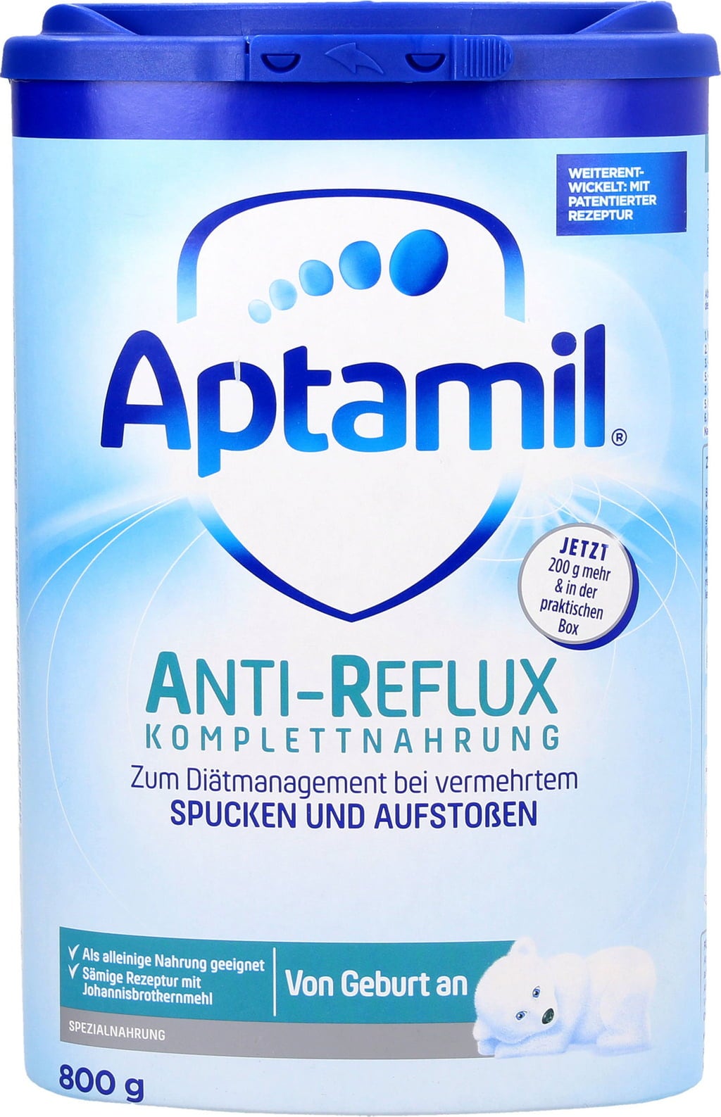 Aptamil ANTI-REFLUX is ontwikkeld als complete voeding voor baby's die last hebben van reflux en regurgitatie. Bij reflux stroomt de inhoud van de maag terug in de slokdarm, terwijl bij regurgitatie de inhoud van de maag omhoog komt in de mond van je baby. Het is samengesteld met johannesbroodpitmeel, een natuurlijk verdikkingsmiddel, dat de voeding dikker maakt en helpt om in de maag te blijven.