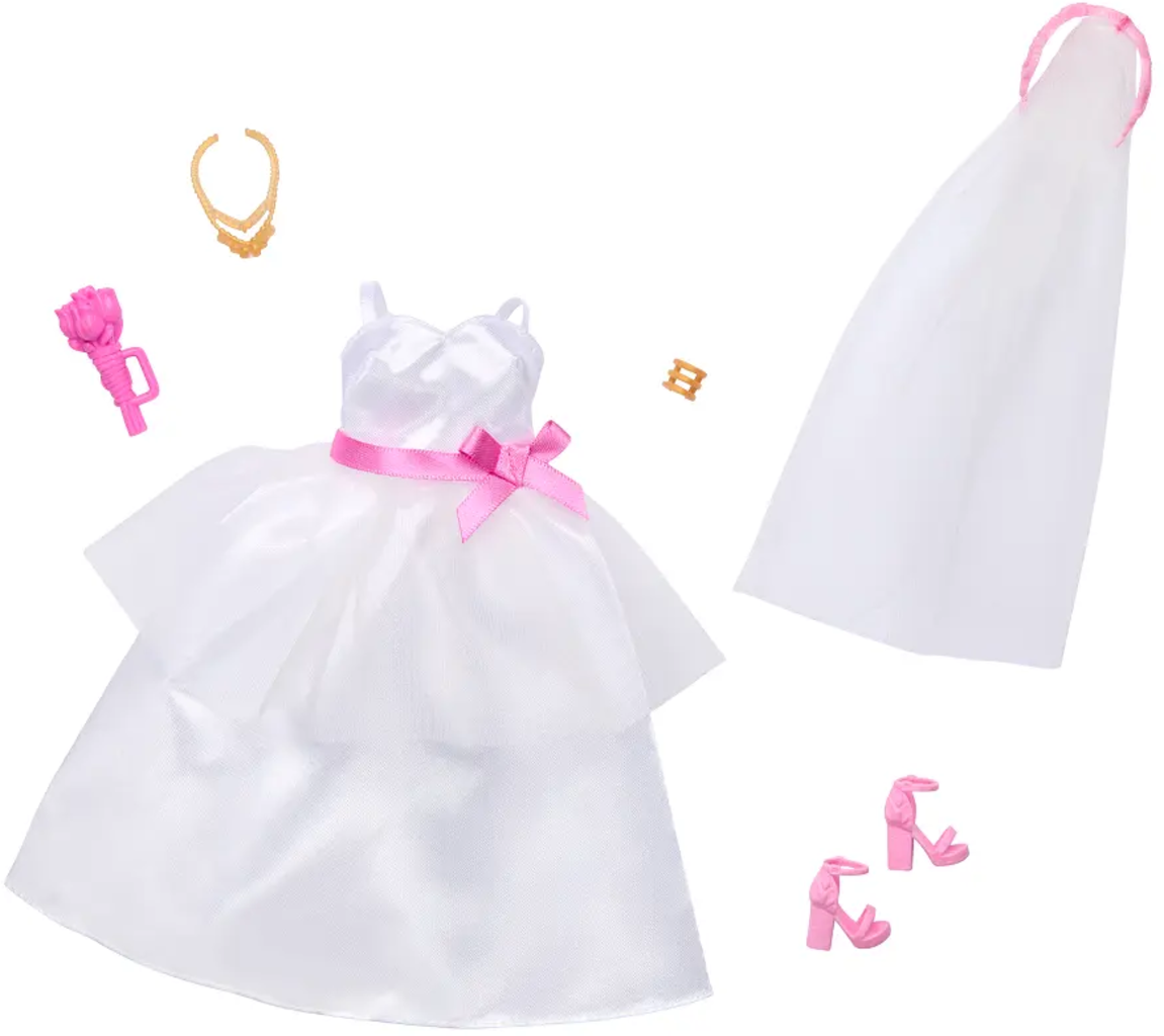 Elke bruiloft is perfect met de Barbie bruidsmodeset! De set bestaat uit een zijdeachtige trouwjurk met roze strik en delicate overrok, een vloeiende sluier met hoofdband en accessoires zoals een gouden ketting, armband, roze bloemenboeket en sandalen met bandjes. Kinderen kunnen creatieve trouwverhalen opvoeren met Barbie en Ken (apart verkrijgbaar).