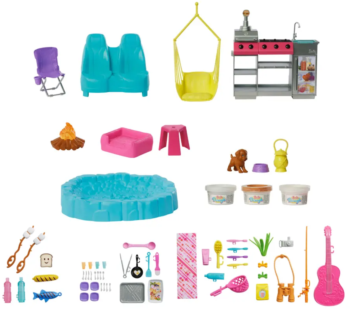 Eindeloze avonturen in de buitenlucht wachten op je met de Barbie Super Adventure Camper speelset! De camper kan open en heeft een pop-up daktent, woonkamer, eethoek en badkamer. Meer dan 60 accessoires zoals een barbecue met kleurveranderend effect, hangstoel, hengel, picknickgerei en een schattig hondje zorgen voor creatief speelplezier. Kinderen kunnen hun eigen campingverhalen verzinnen, van vissen tot marshmallows roosteren - de camper is de perfecte metgezel voor fantasierijk spel. Poppen niet inbegrepen.