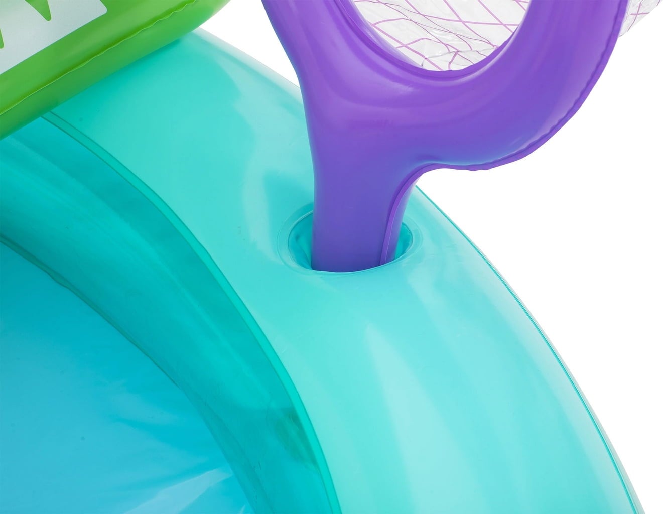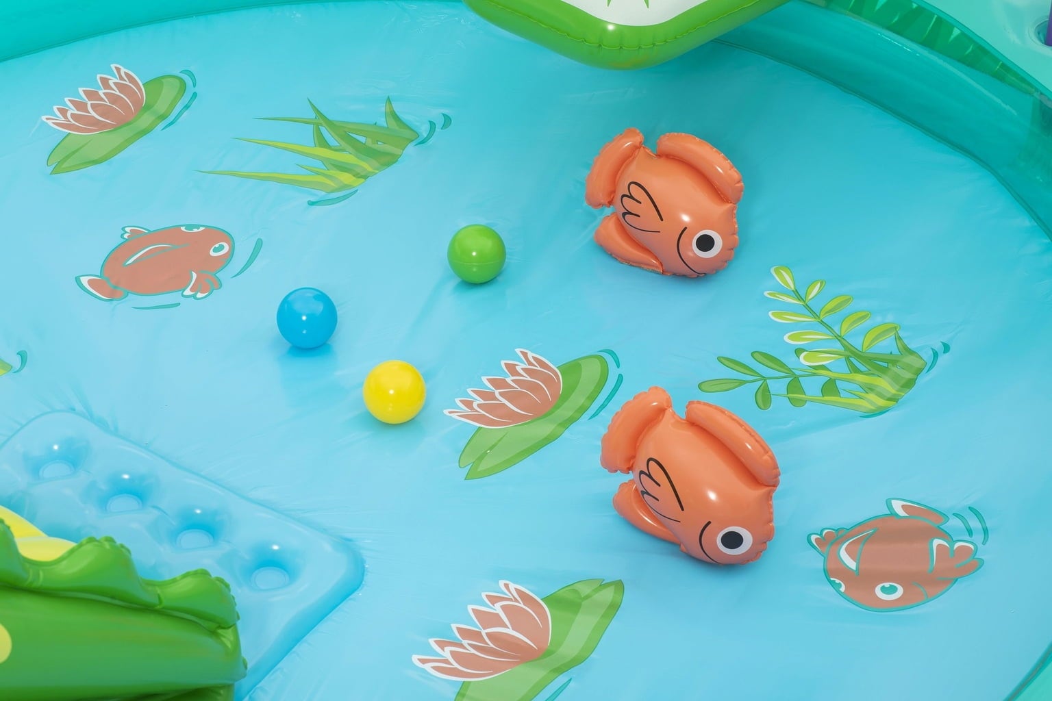 De waterglijbaan met zacht landingskussen garandeert zachte landingen en veel glijplezier. Een werpspel in de vorm van de bek van een krokodil daagt uit tot behendigheid, en de meegeleverde PuffyPal™ speelvissen en speelballen kunnen worden gevangen met het afneembare schepnet.