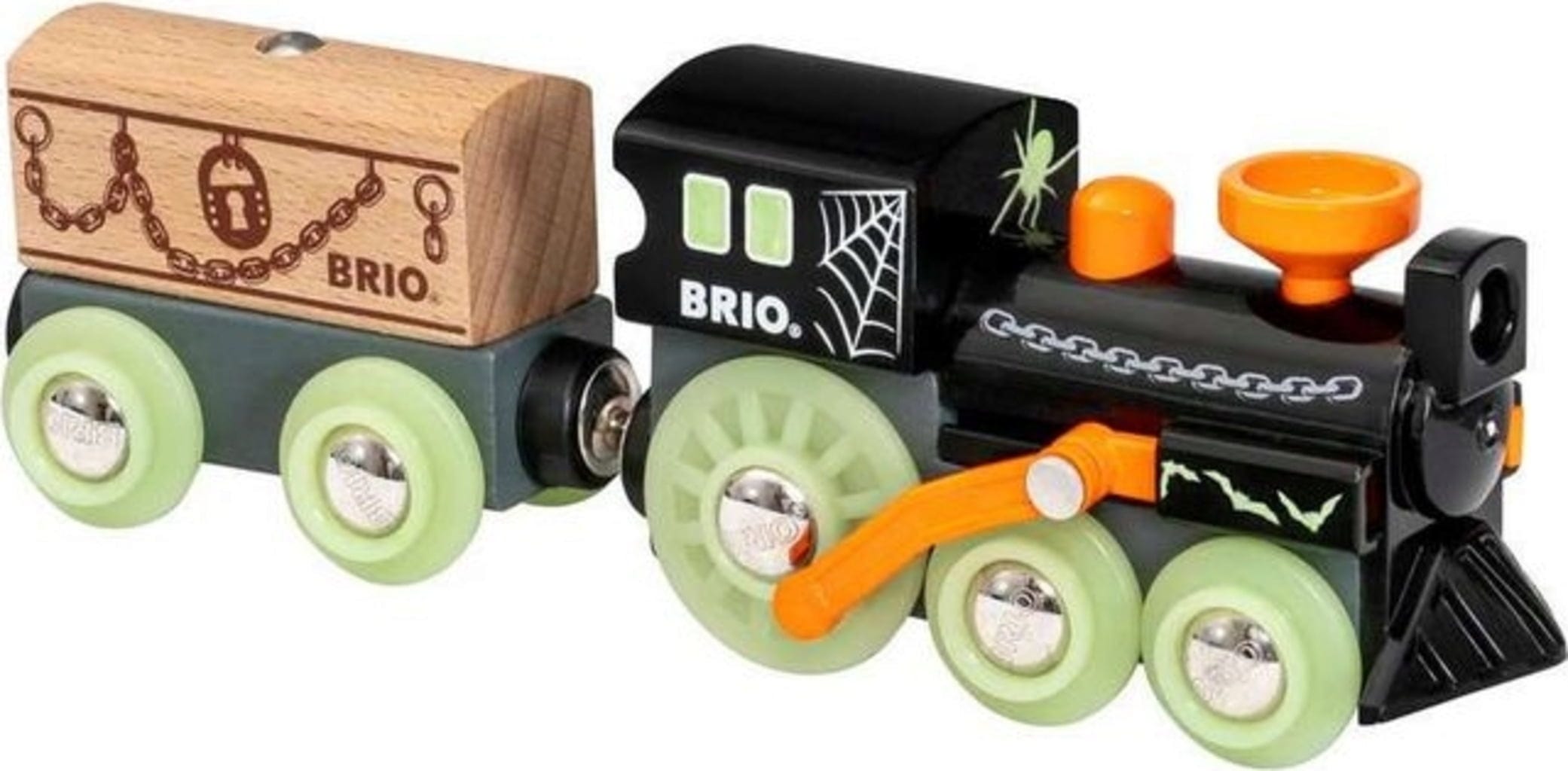 De spooktrein komt je BRIO spoorweg onveilig maken! De wielen en details geven een griezelig licht in het donker. En wat zou er toch verborgen zitten in die mysterieuze houten kist?