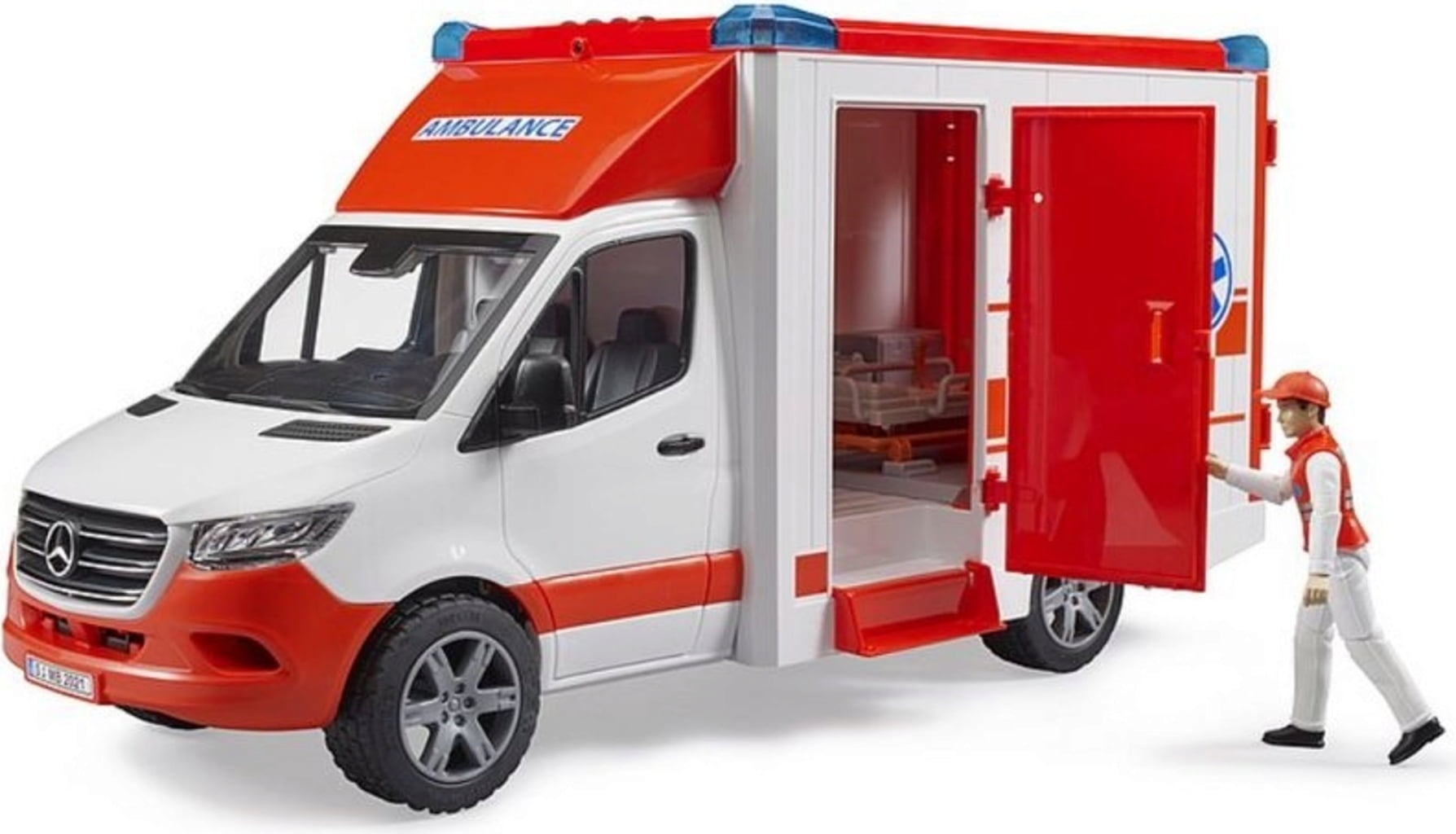 De ruime Sprinter van Mercedes-Benz is een echte allrounder als het om transport gaat. Daarom is hij ook populair bij hulpdiensten. Als gedetailleerd BRUDER-voertuig laat hij niets te wensen over. Het volledig uitgeruste interieur is dankzij het afneembare dak heerlijk bespeelbaar. De brancard kan door de kleine paramedicus worden uit- en ingeschoven. De geïntegreerde licht- en geluidsmodule produceert blauw licht en sirenegeluiden