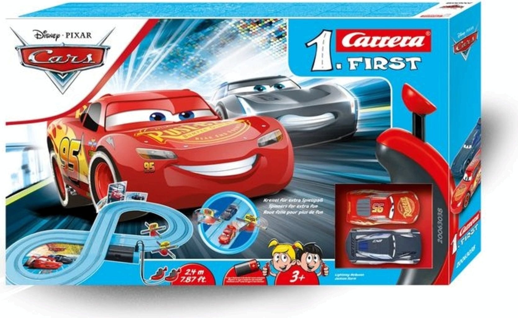 Lightning McQueen en Jackson Storm strijden in een spannende nek-aan-nekrace. Op de nieuwe CARRERA First-baan kan elk klein detail doorslaggevend zijn. Zal het Lightning lukken om zijn concurrent te verslaan?