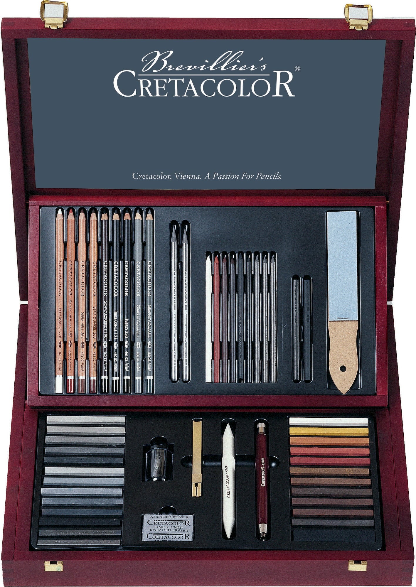 Potloden en stiften, rood krijt, sepia, wit en zwart krijt, houtskool, nero, grafiet aquarel en monoliet grafiet, bruin en grijs krijt, houtskool, schets houtskool, grafiet sticks