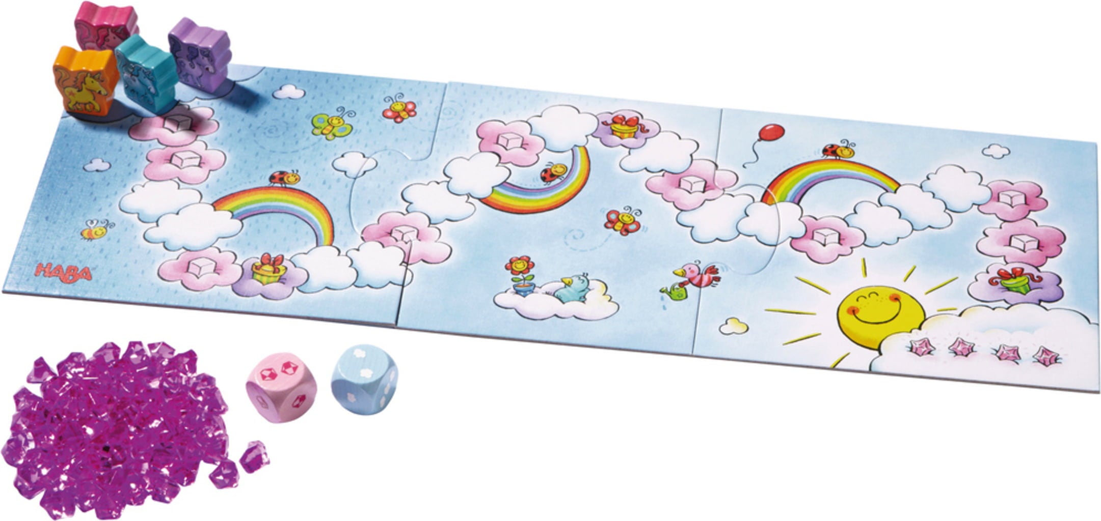 Inhoud: 1 spelbord, 1 roze eenhoorn glitter geluk, 1 gele eenhoorn sterrenstof, 1 paarse eenhoorn wonderbloem, 1 turquoise eenhoorn magische werveling, 60 wolkenkristallen, 1 roze kristallen kubus, 1 blauwe wolkenkubus, 1 spelregels