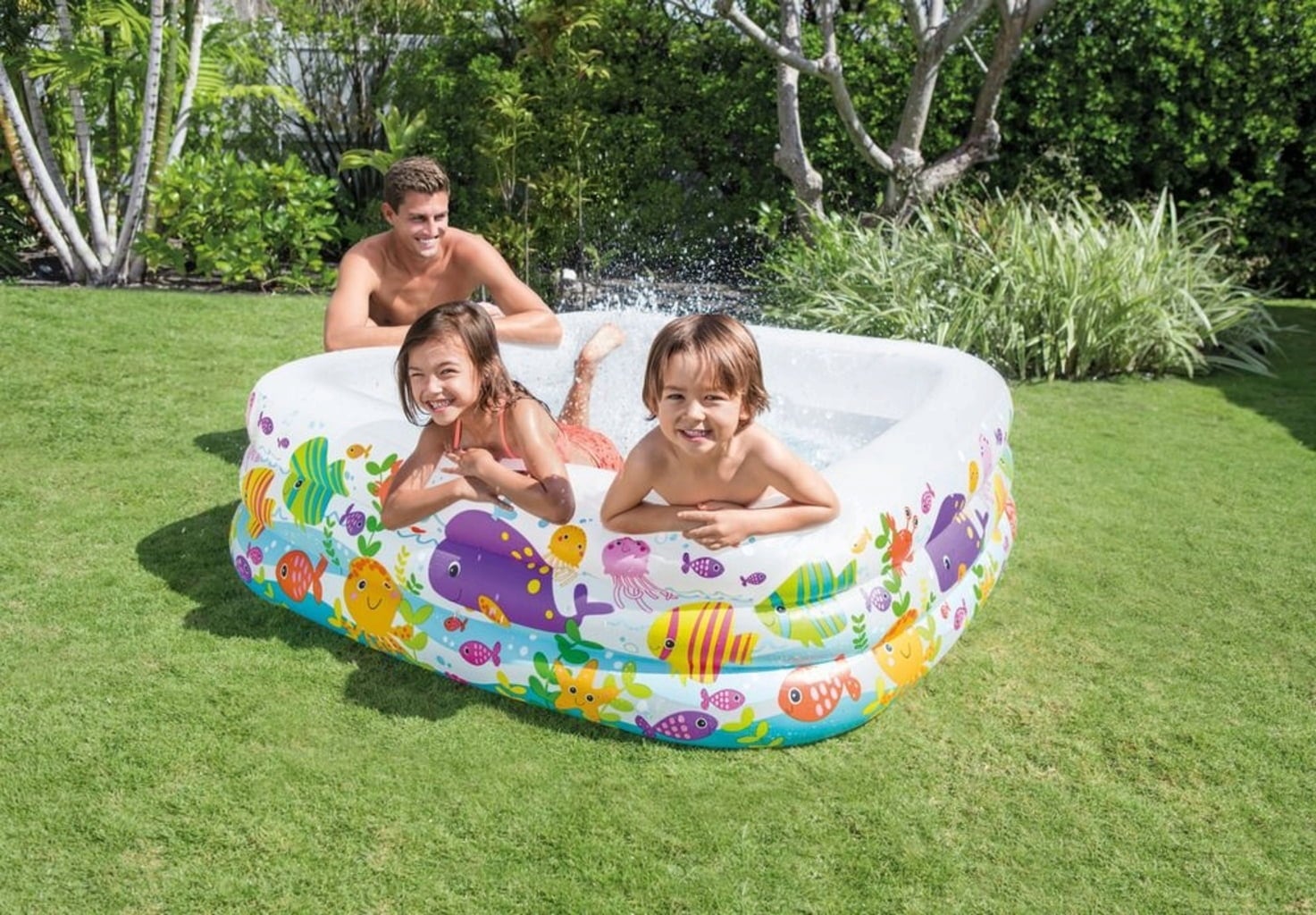 De kleurrijke motieven aan de buitenkant van het zwembad nodigen kinderen uit om een hele dag in het water te spelen. Het 159 x 159 x 50 cm zwembad geeft ze het het gevoel in een aquarium met vissen te zwemmen. De extra brede zijwanden bieden bescherming en stabiliteit. De watercapaciteit van het zwembad is 424 liter met een vulhoogte van 36 cm. Het zwembad is geschikt voor kinderen vanaf 3 jaar.