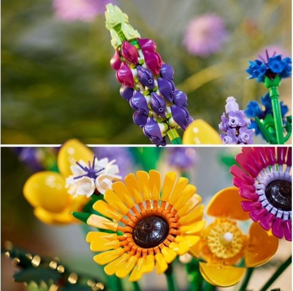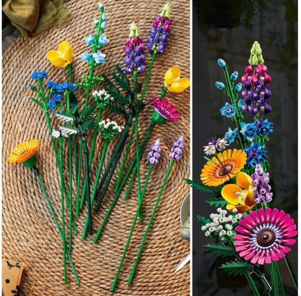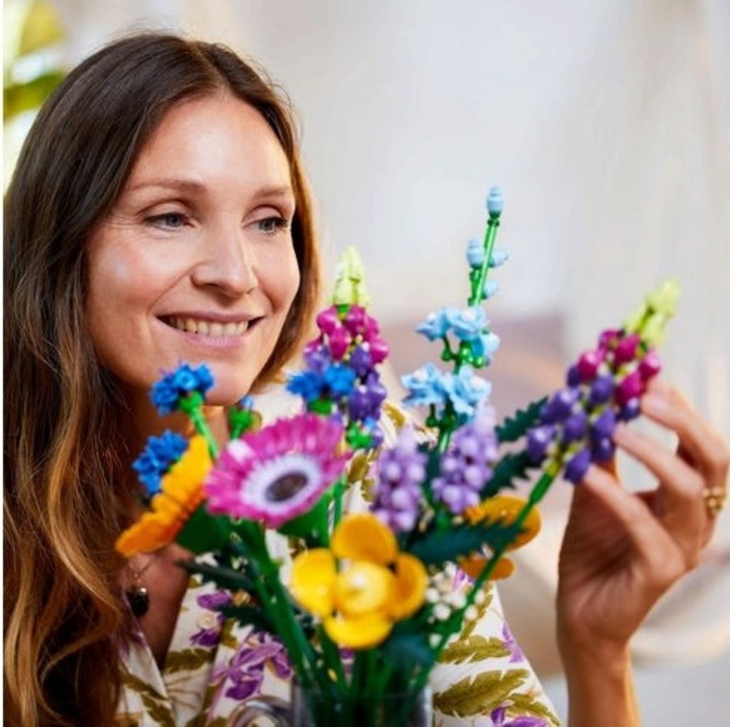 Bij dit boeket moet je een tweede blik wagen om te beseffen dat het LEGO stenen zijn. Want het Boeket met Wilde Bloemen ziet er echt bedrieglijk echt uit! Twee stuks elk van korenbloemen, lavendel, schijnpapaver, fluitenkruid, ledervarens, gerbera's, ridderspoor en lupines kunnen worden gecombineerd met 16 afzonderlijk verstelbare stelen. De perfecte decoratie voor bloemenliefhebbers die nooit verwelkt en ook nooit vers water nodig heeft.