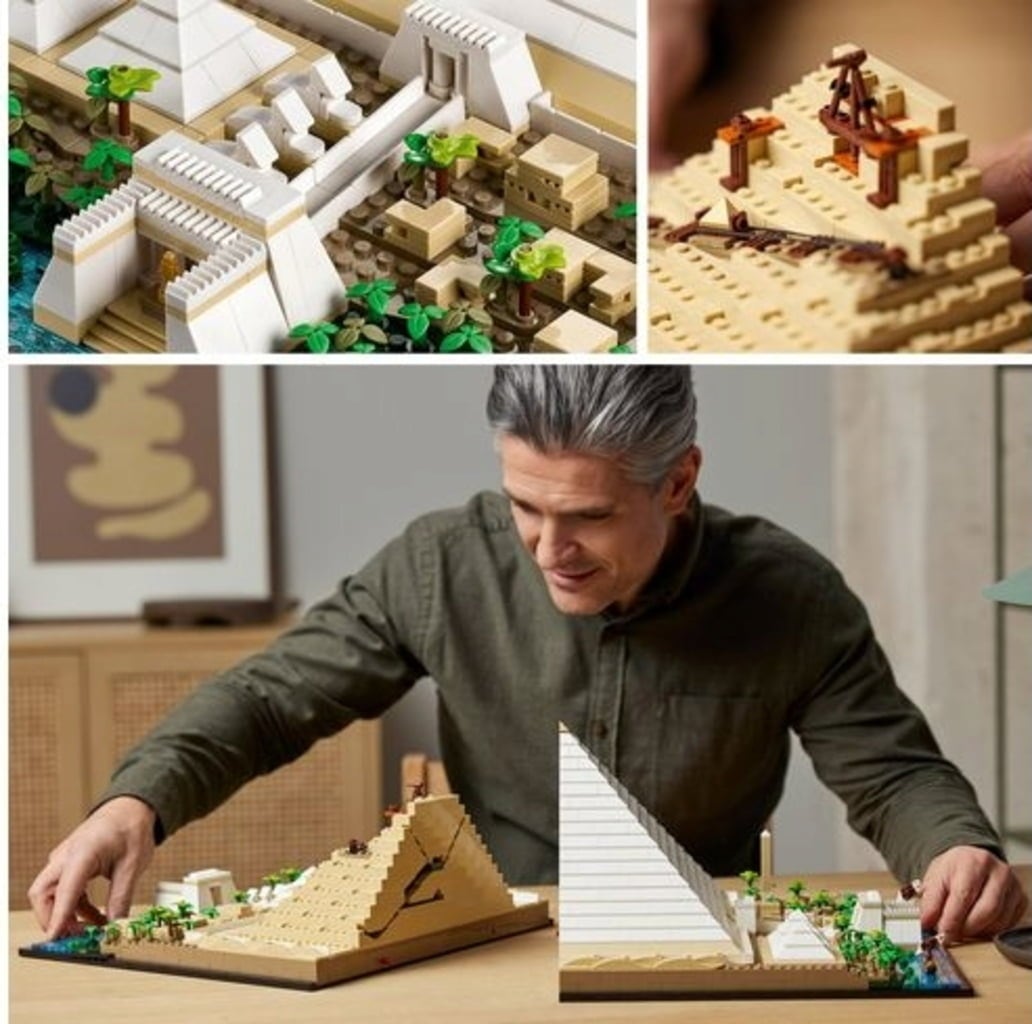 Ga terug in de tijd naar de hoogtijdagen van de vierde dynastie met dit geweldige LEGO Architecture model. Ontdek de Grote Piramide als een gedetailleerd dwarsdoorsnedemodel dat je zelfs een kijkje in de binnenkant geeft. Als je de bekleding van de piramide verwijdert, ontdek je het eeuwenoude steenbewegingssysteem. Naast het imposante bouwwerk zelf bevat de set ook twee boten, twee kleinere piramides, twee dodentempels, sfinxbeelden, een arbeidersdorp en een obelisk. Als je niet houdt van halve dingen, kun je een tweede set bestellen om de vorm van de piramide compleet te maken.
