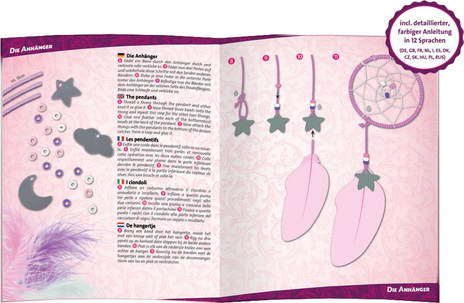 • Inhoud: 3 gekleurde leren banden, metalen ring, lijm, veren, maan en sterren hangers, draad, instructies