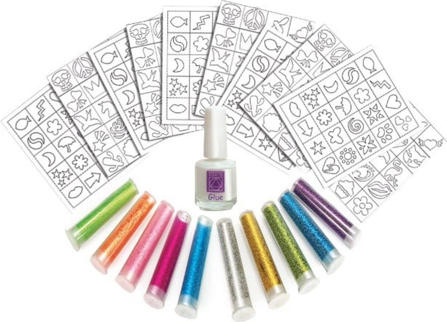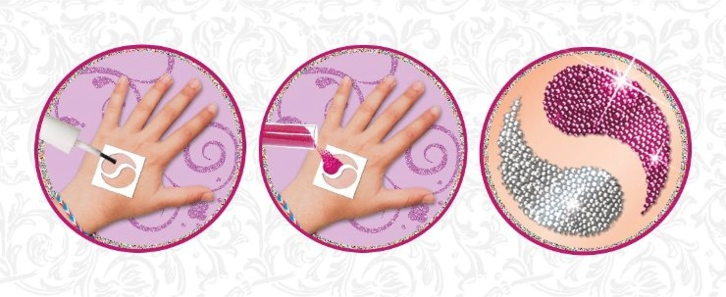 Tover gewoon je eigen glittertattoos! Zo werkt het: Kies een van de 40 verschillende ontwerpen. Breng het aan op het gewenste gebied met het zelfklevende oppervlak naar beneden gericht. Breng de speciale lichaamslijm aan. Voeg nu gewoon de bijpassende miniparels in je favoriete kleur toe en laat de lijm even drogen. Jij en je vrienden zullen versteld staan!