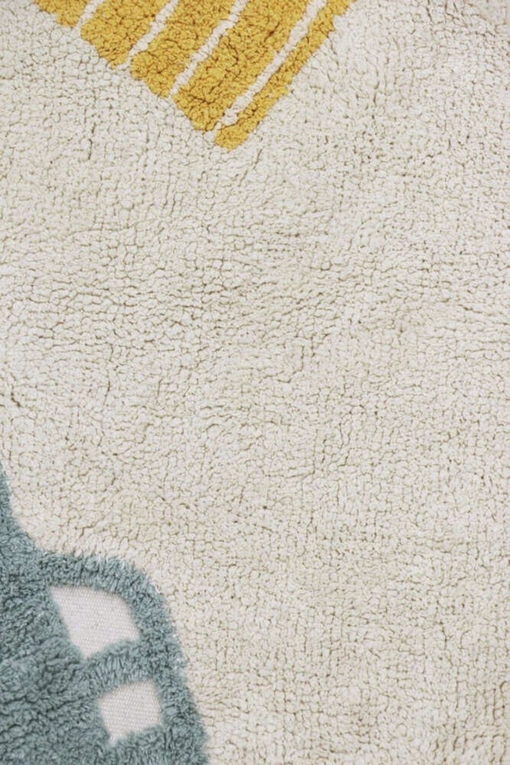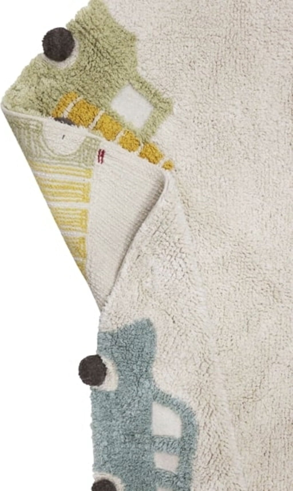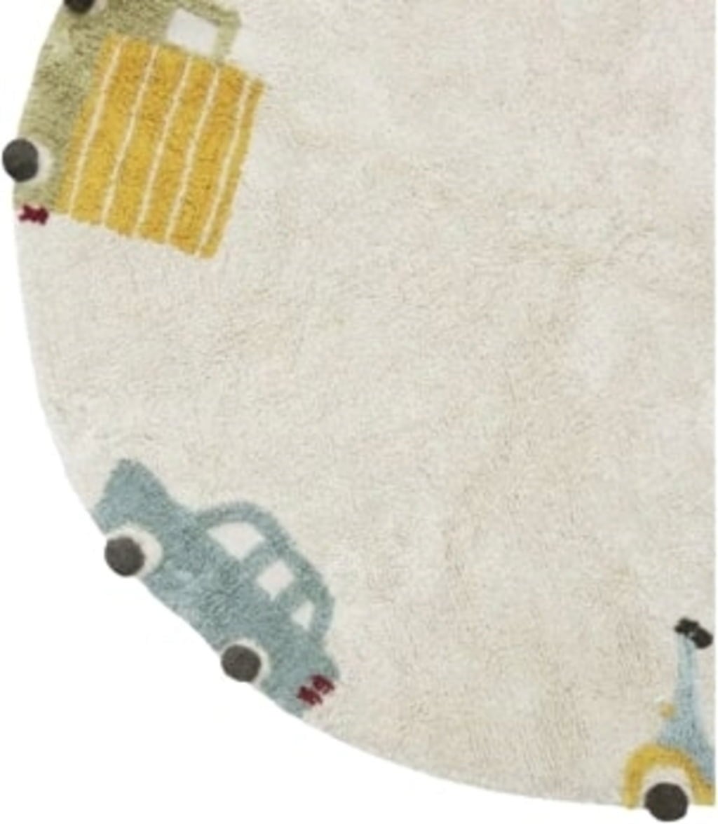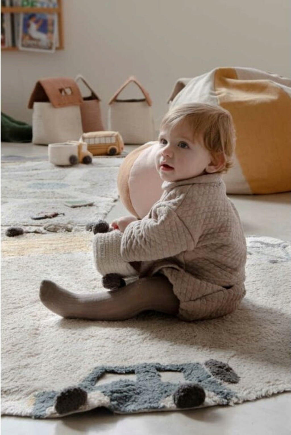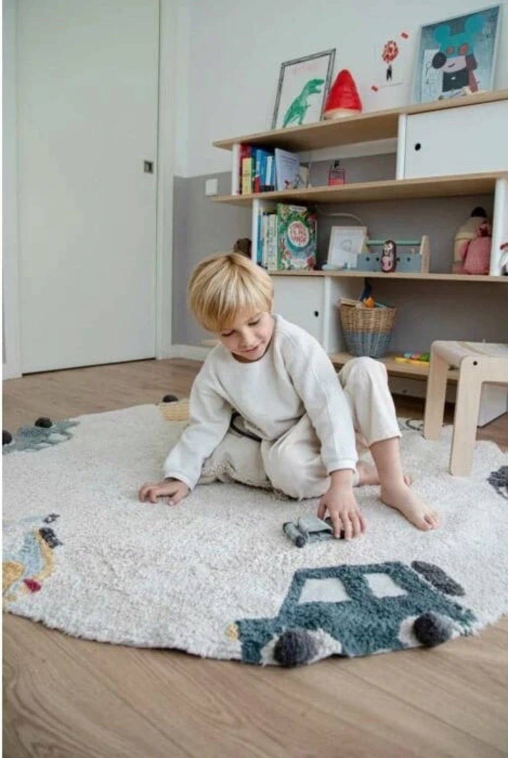 Versierd met verschillende voertuigen zoals een auto, vrachtwagen en Vespa, waarvan de wielen gemaakt zijn van donkergrijze katoenen bobbels, nodigt het kleed kinderen uit om te spelen!
