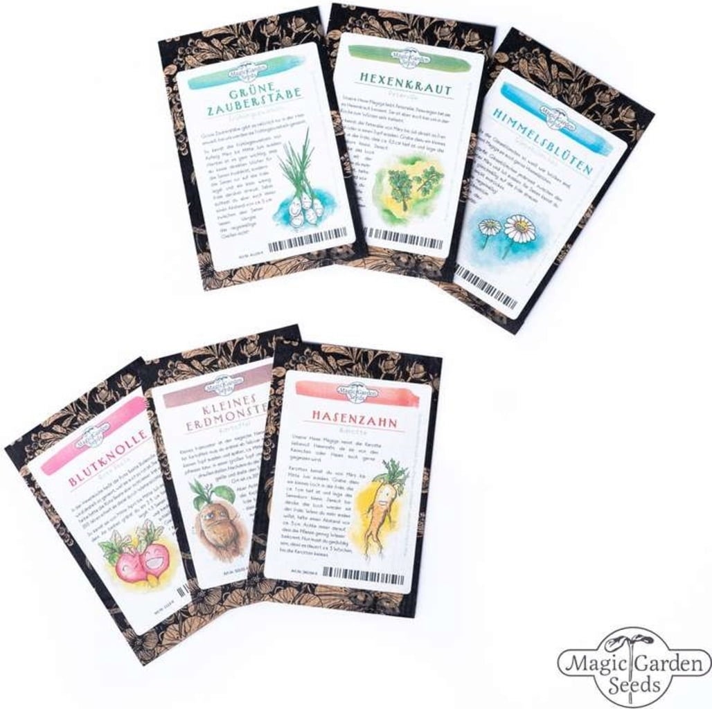• 6 zaadzakjes met magische namen: wortel, rode biet, aardappel, lente-ui, madeliefje, peterselie