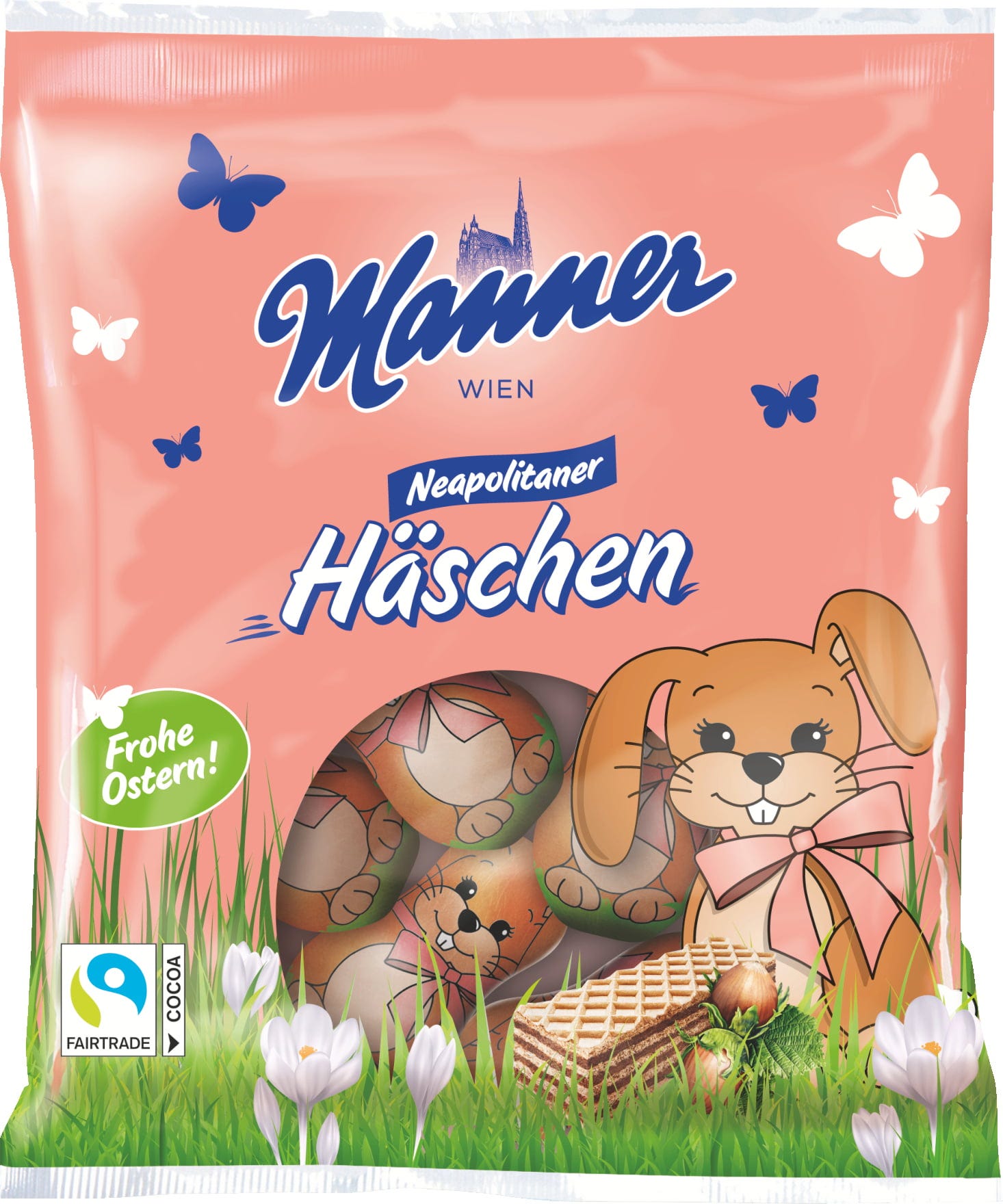 Deze kleine Napolitaanse Haasjes van Manner zijn bijna te schattig om op te eten! Elk haasje is verleidelijk aan de buitenkant met een omhulsel van delicate melkchocolade en aan de binnenkant met een aromatische vulling van Napolitaanse room. De schattige verpakking is de kers op de taart en maakt deze kleine haasjes tot de perfecte paasdecoratie
