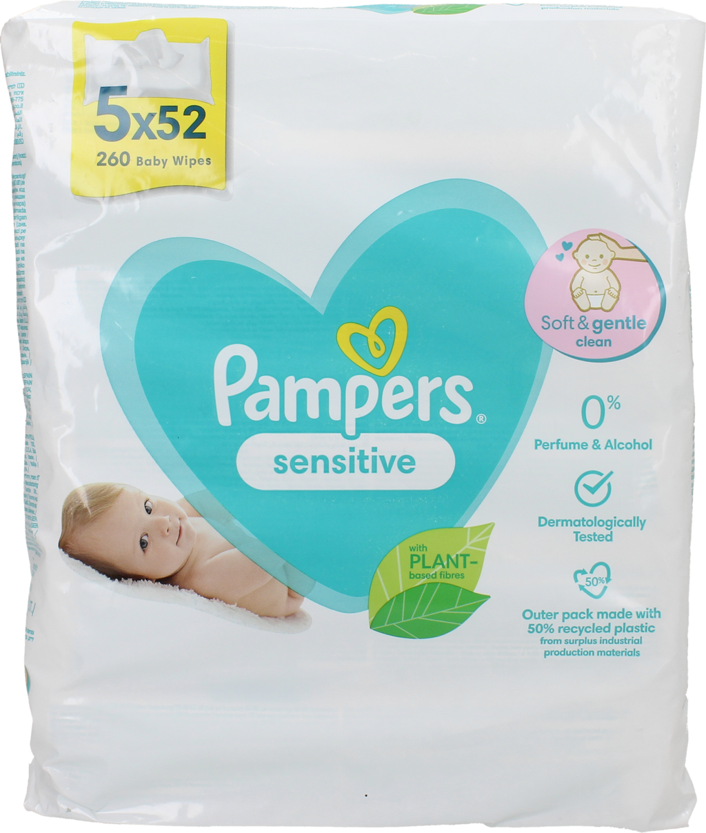 Met de Sensitive Babydoekjes van Pampers wordt de gevoelige babyhuid grondig en voorzichtig gereinigd. De vochtige doekjes zijn gemaakt van plantaardige vezels, zijn vrij van parfum, alcohol en kleurstoffen en zijn dermatologisch getest. De unieke verzorgende formule van Pampers vochtige doekjes beschermt de pH-waarde van de gevoelige babyhuid en vermindert zo de kans op huidirritatie.
