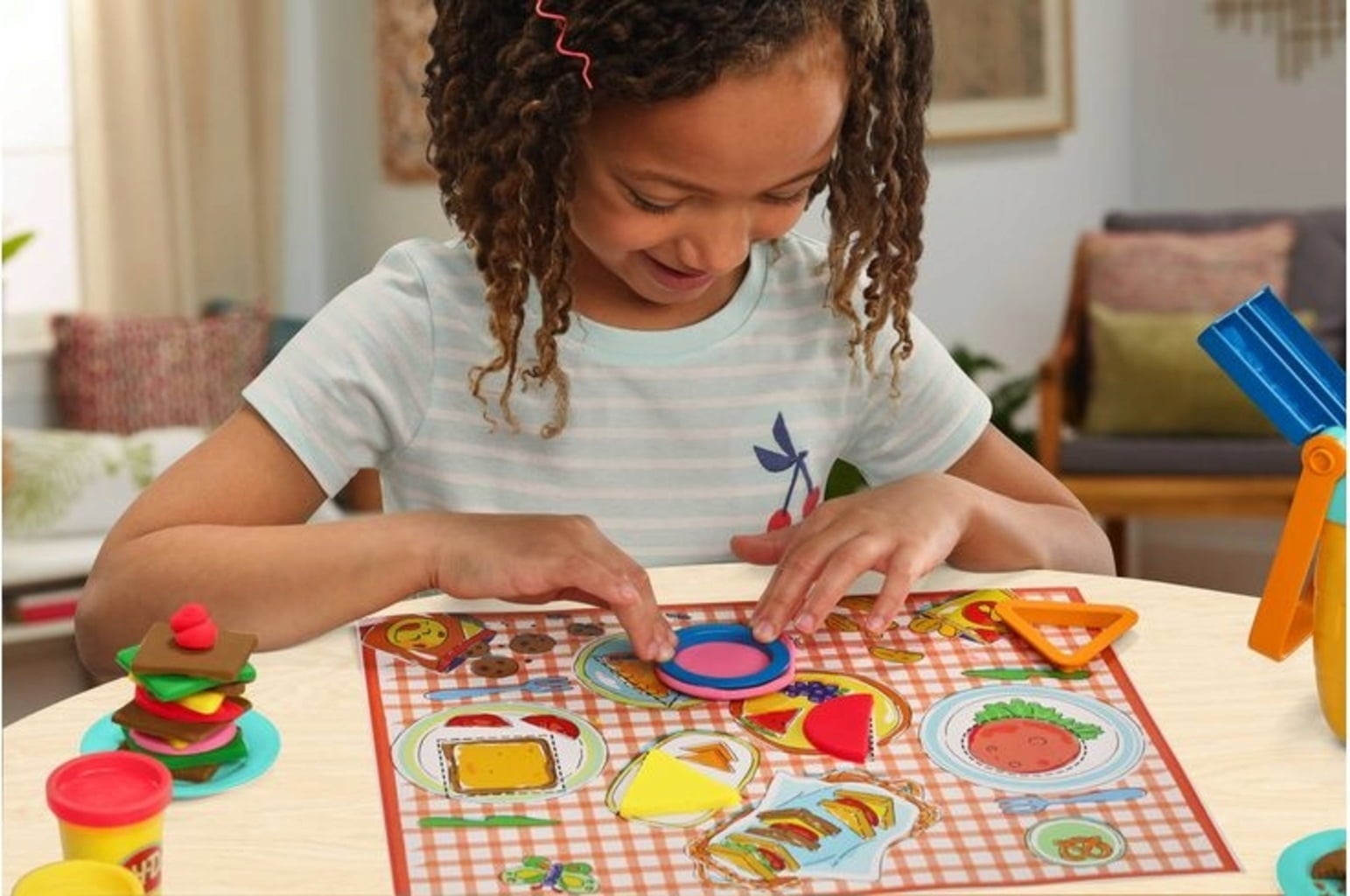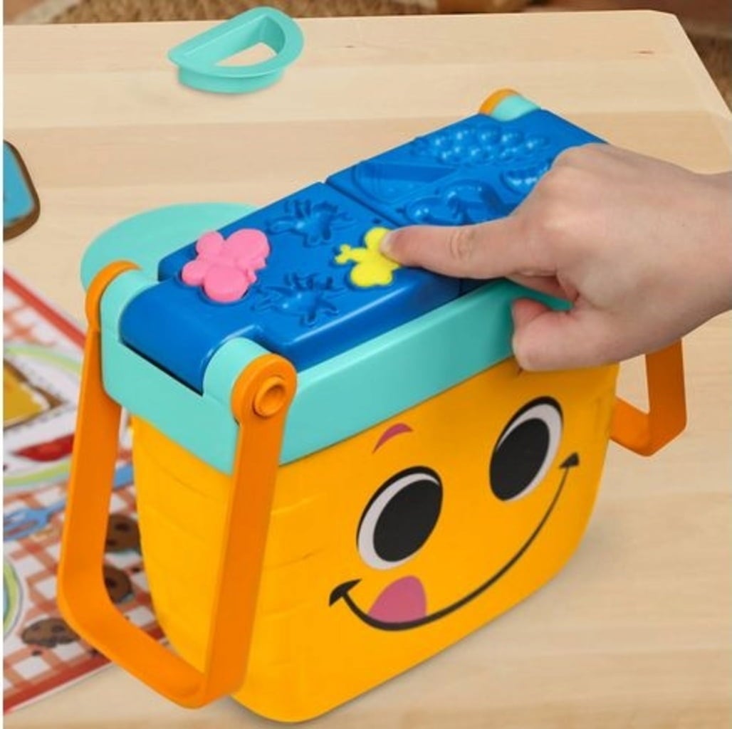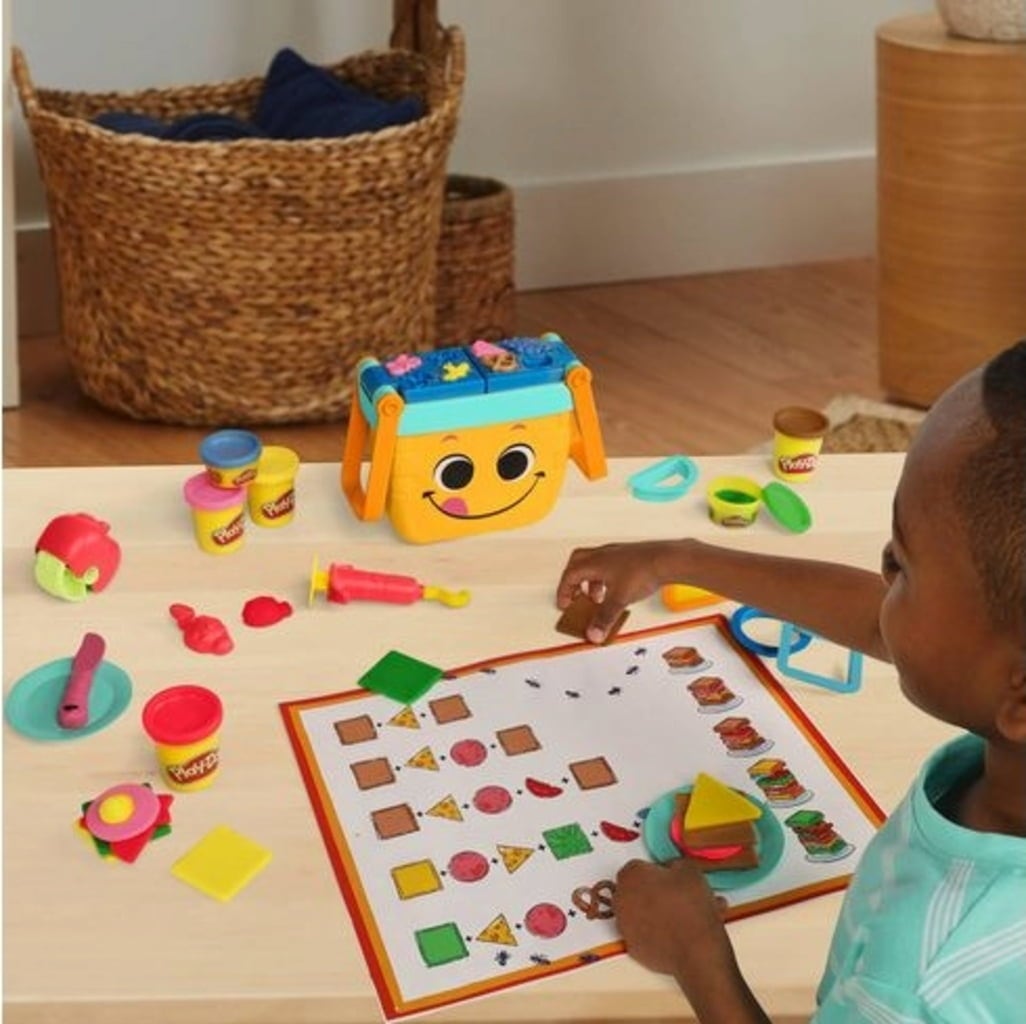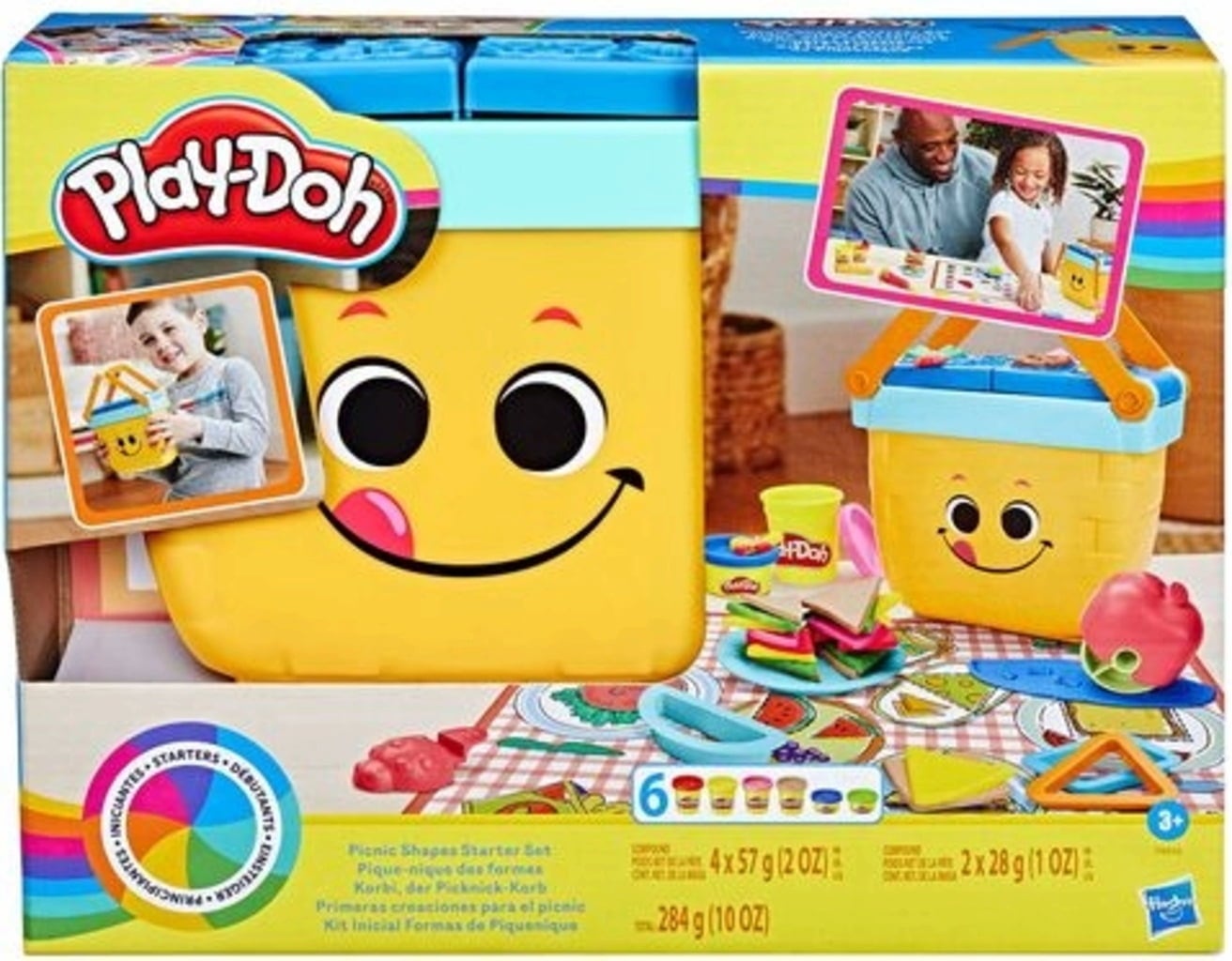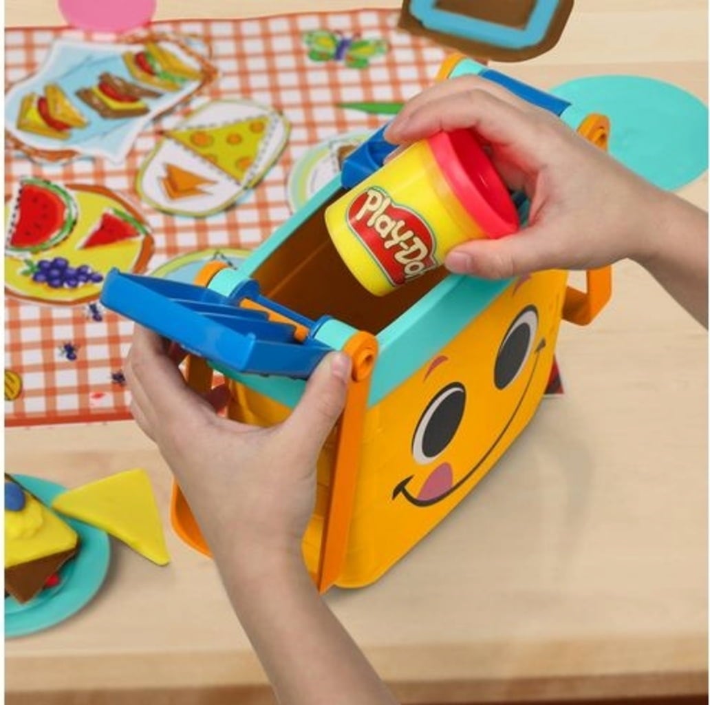 Inhoud: picknickmand met handvatten en deksel met vormen, dubbelzijdig bedrukte speelmat, 4 basisvormsnijders, lieveheersbeestje-stempel, appelrolstempel, 2 boetseerrollen, decoratiegereedschap, boetseermes, 2 borden, 4 potjes Play-Doh klei van 56 g elk (bruin, rood, geel, roze), 2 potjes Play-Doh klei van 28 g elk (groen, blauw) - klei bevat tarwe