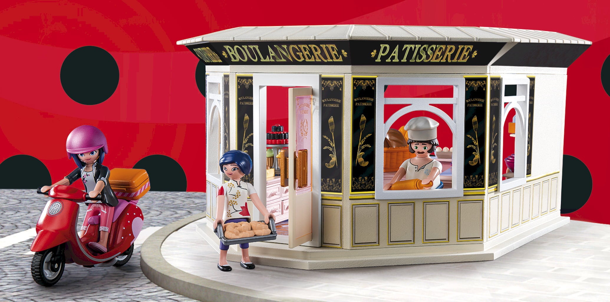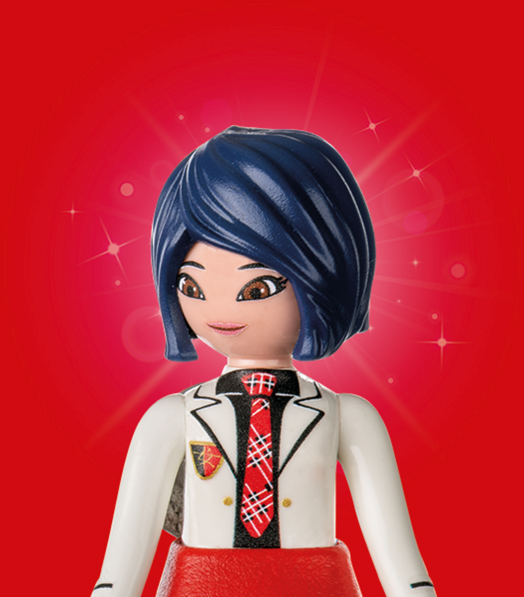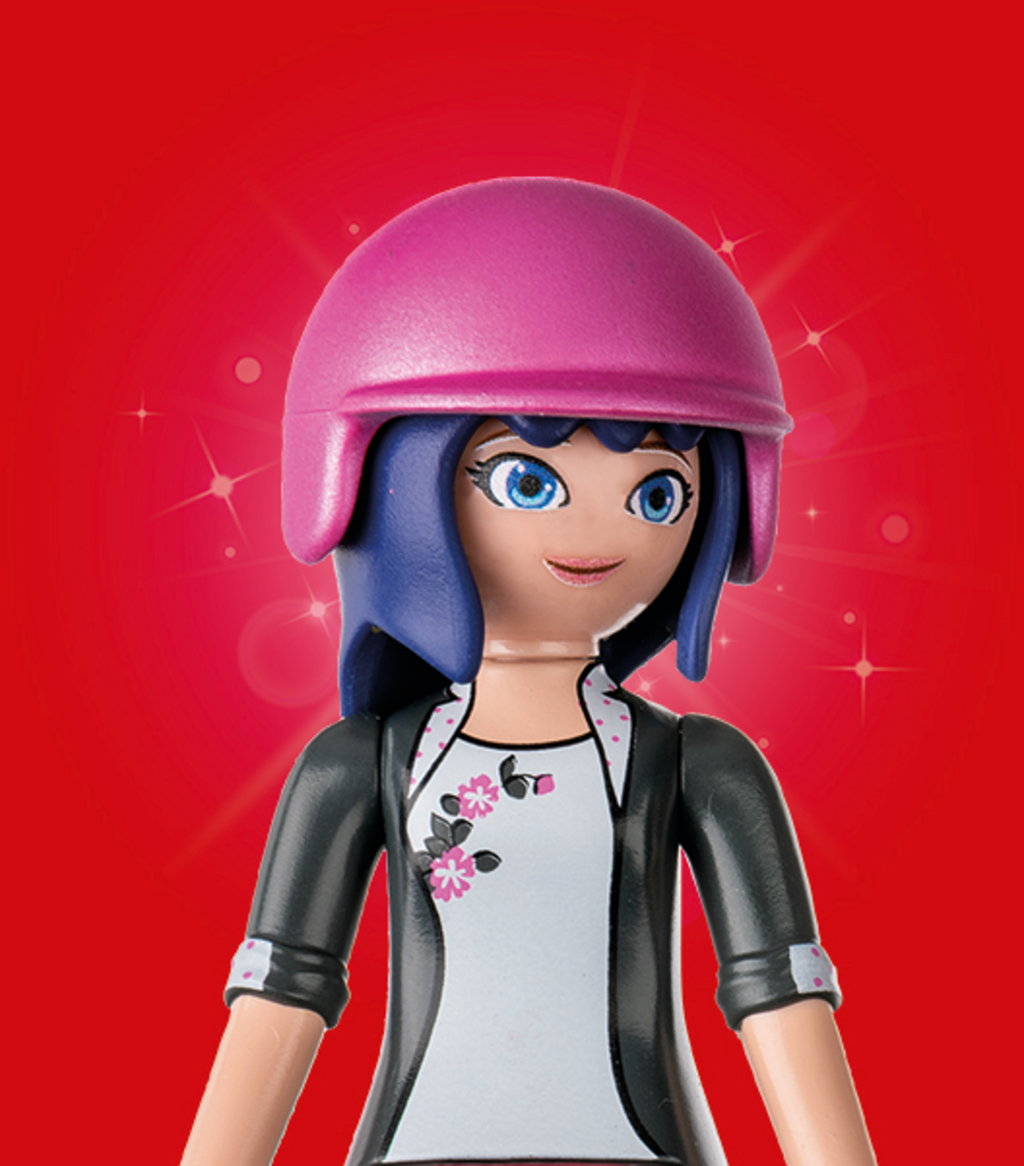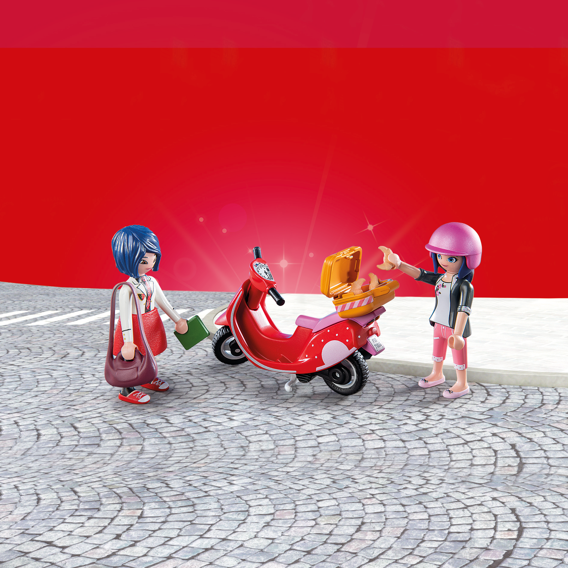 Inhoud: 2 tieners (Marinette Dupain-Cheng & Kagami Tsurugi), 2 duiven, 1 reclamezuil, 1 scooter met mand, 1 helm, 3 croissants, 1 schoudertas, 1 boek