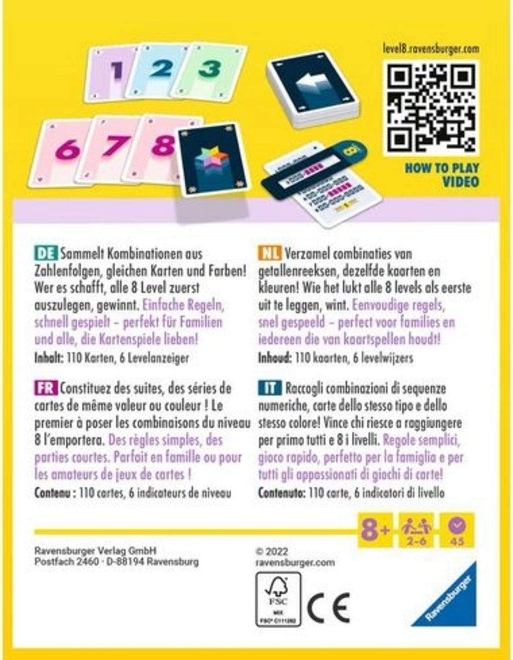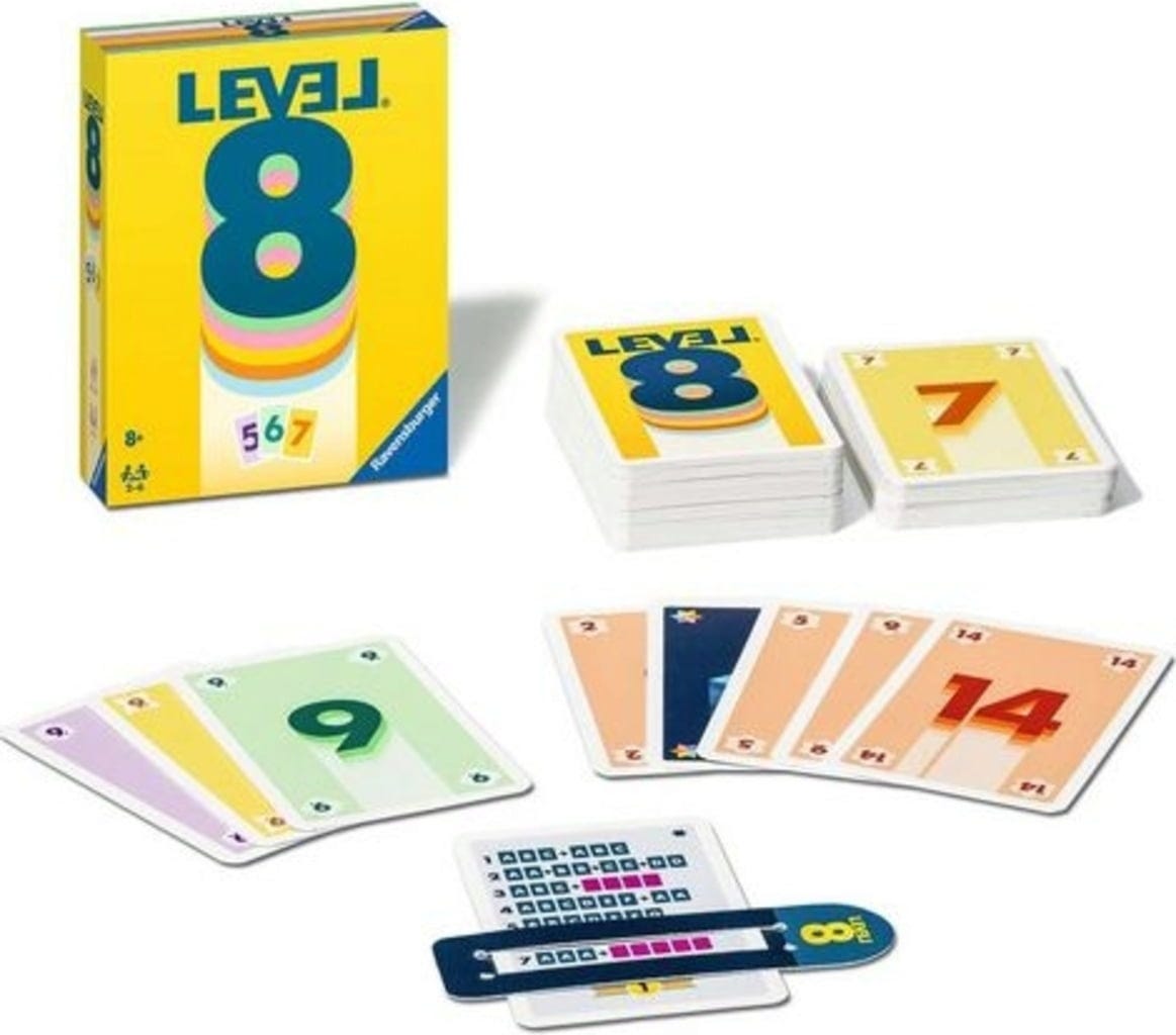 Inhoud: 110 speelkaarten, 6 level-indicatoren, 4 spelregels