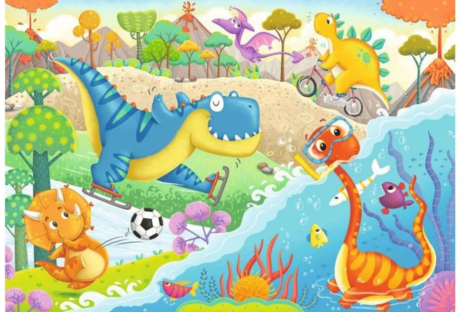 Duiken, fietsen, lezen of skaten – ga mee op stap met deze schattige dino-kinderen en hun favoriete hobby's. Ondertussen train je spelenderwijs je oog-handcoördinatie en je logisch denkvermogen.