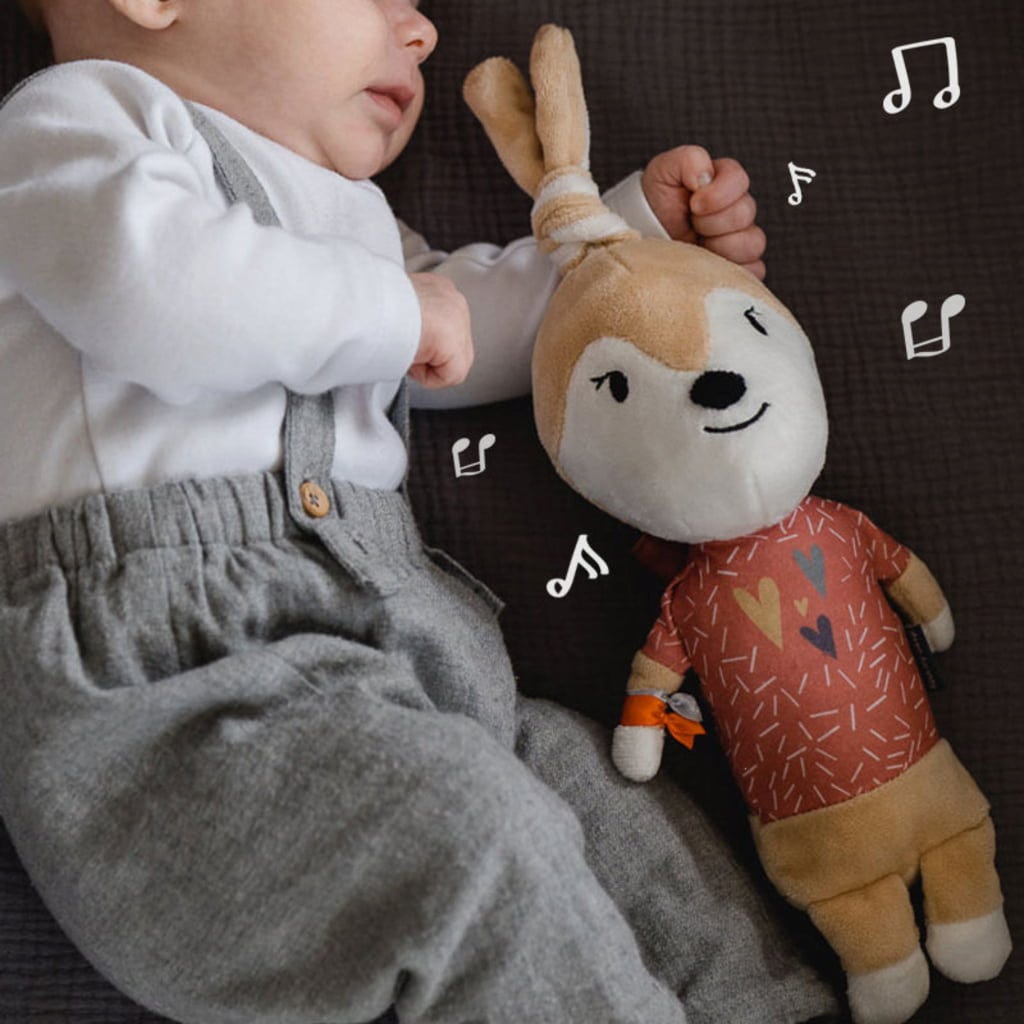 Bij het naar bed gaan mag Ivy het Konijn niet langer ontbreken. Deze schattige stoffen knuffel heeft een individueel bespeelbare muziekspeler. Zo kun je het slaapritueel volledig naar je eigen muzikale wensen vormgeven. Of het nu gaat om zachte melodieën of rustgevende verhalen voor het slapengaan, deze muziekdoos is een echte hit.